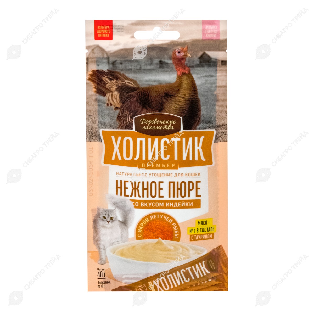 ДЕРЕВЕНСКИЕ ЛАКОМСТВА Холистик Нежное пюре из индейка с икрой для кошек, 4 шт по 10 г