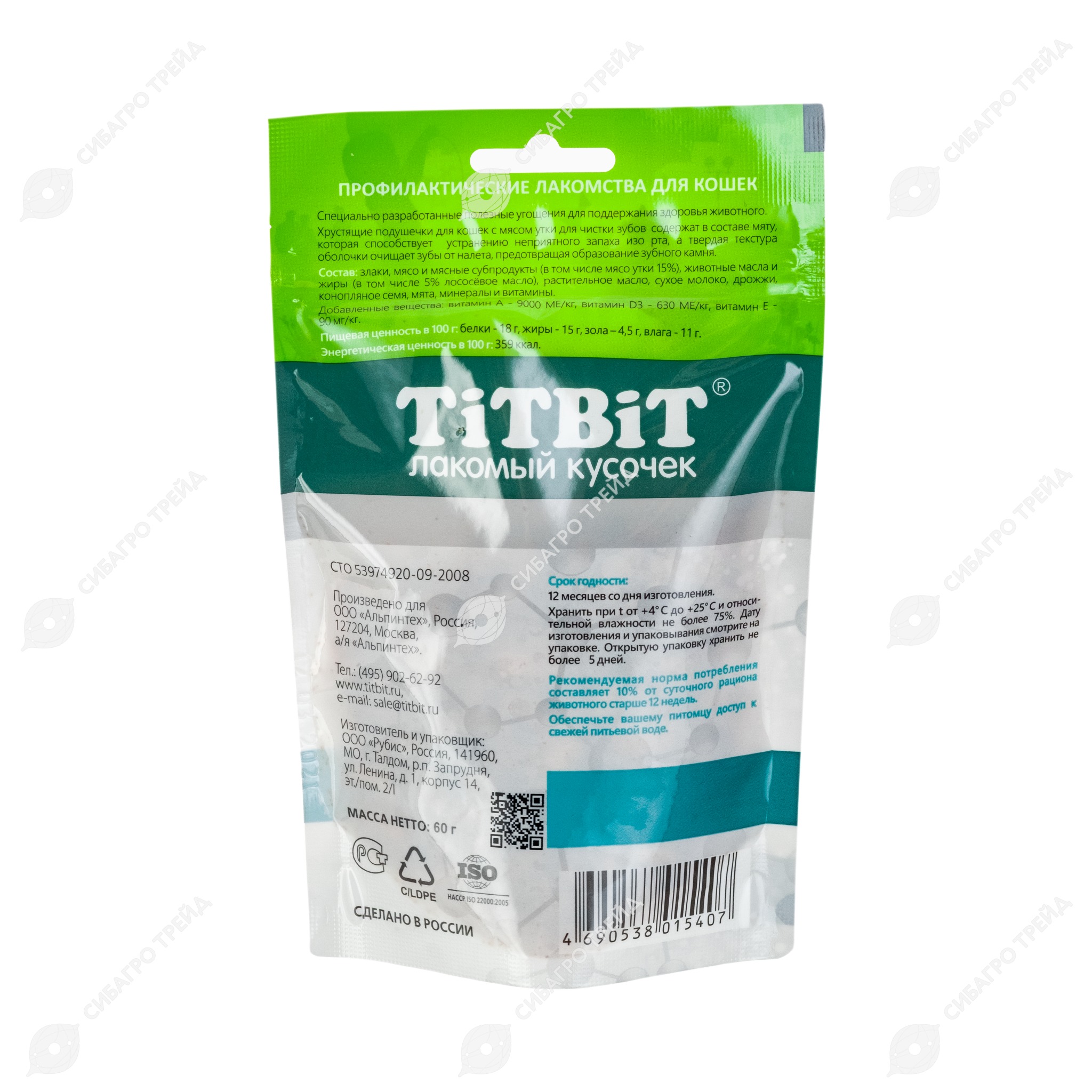 TITBIT лакомство хрустящие подушечки для кошек с мясом утки для чистки зубов, 60 г