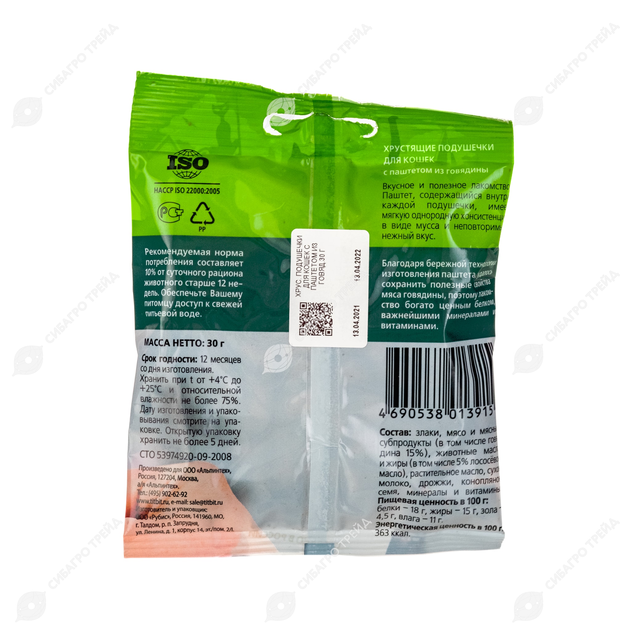 TITBIT лакомство хрустящие подушечки для кошек с паштетом из говядины, 30 г