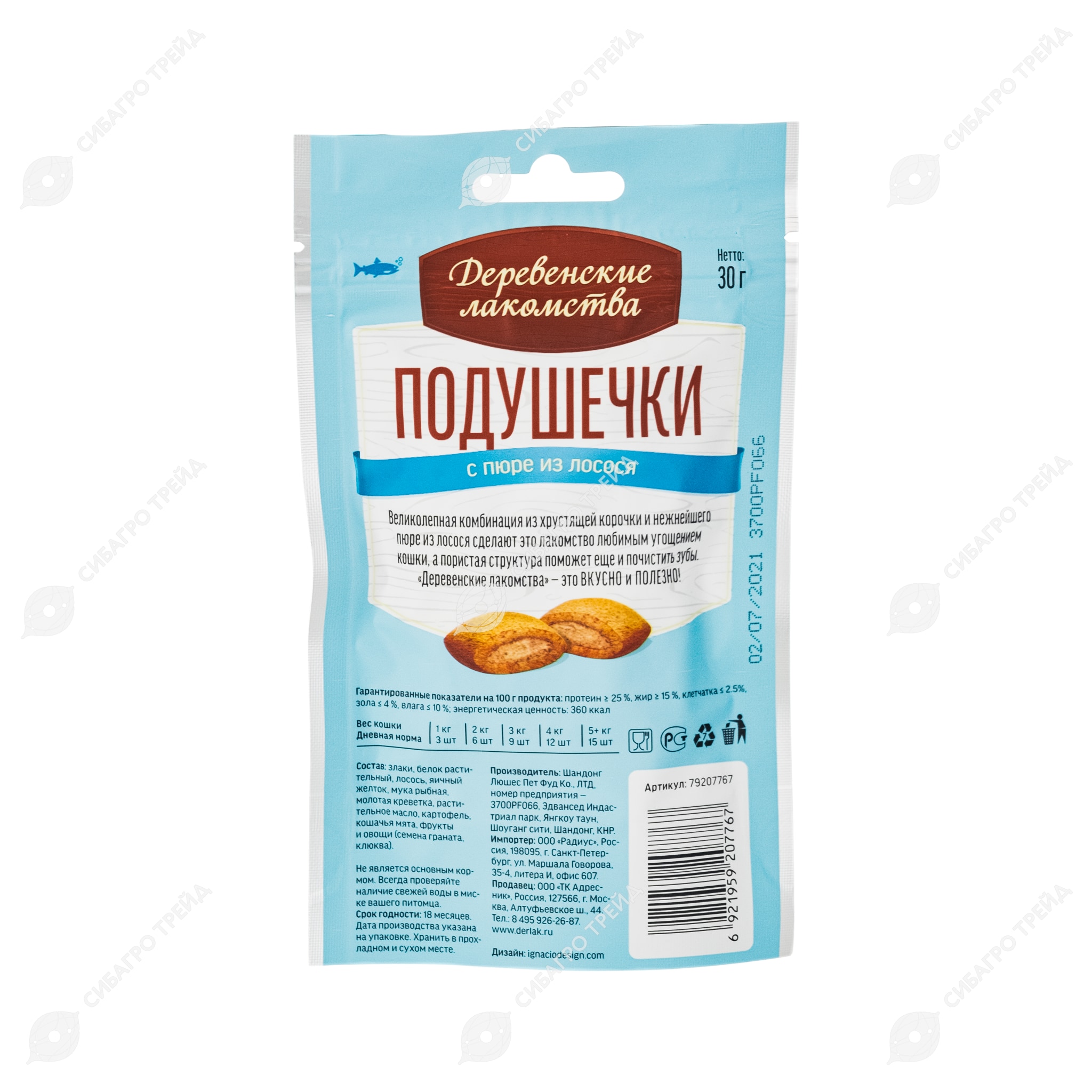 ДЕРЕВЕНСКИЕ ЛАКОМСТВА подушечки с пюре из лосося для кошек, 30 г