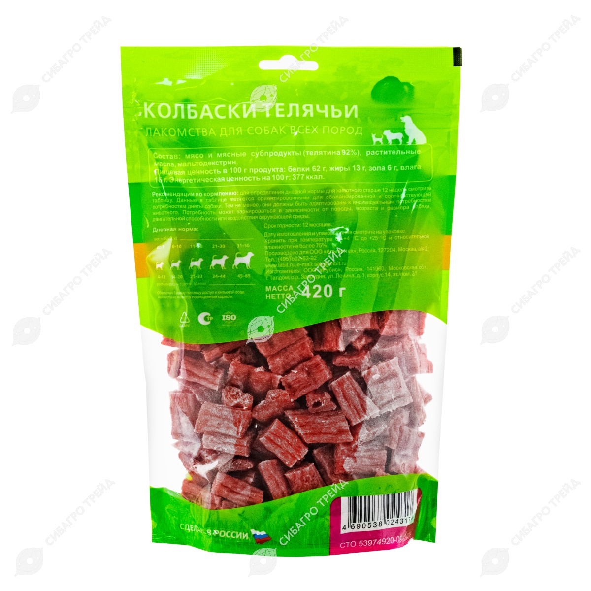 Колбаски телячьи - это аппетитное угощение для собак всех пород. Благодаря высокому содержанию мяса (92%) и бережной технологии приготовления, имеет привлекательный внешний вид и вкус. Мясо и мясные субпродукты, входящие в основу колбасок, являются превосходным источником высококачественного животного белка, витаминов и минералов. Выгодная XXL упаковка с удобным замком zip-lock сохранит лакомство и продлит удовольствие Вашего любимца.