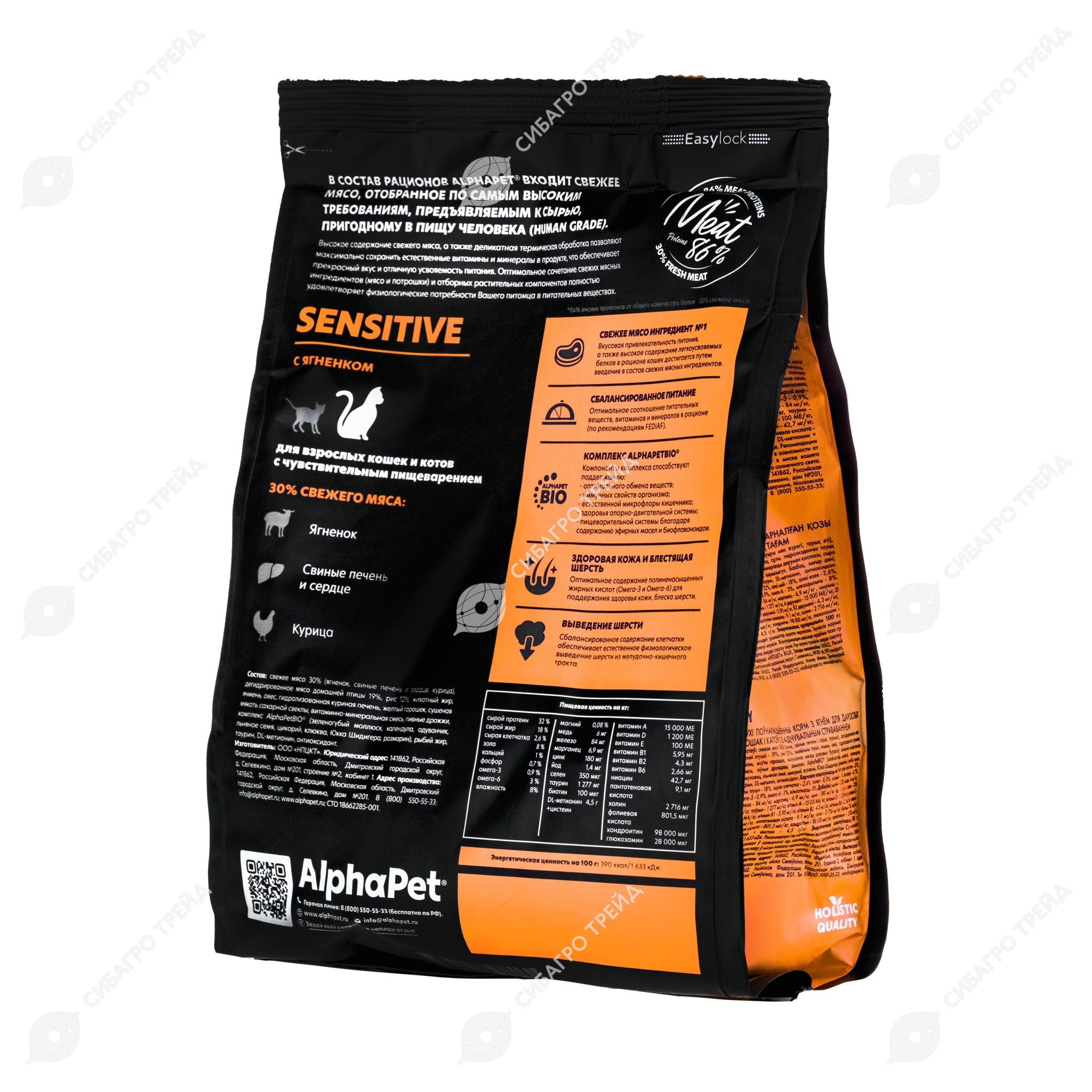 ALPHAPET для взрослых кошек и котов с чувствительным пищеварением (ЯГНЕНОК), 0,4 кг