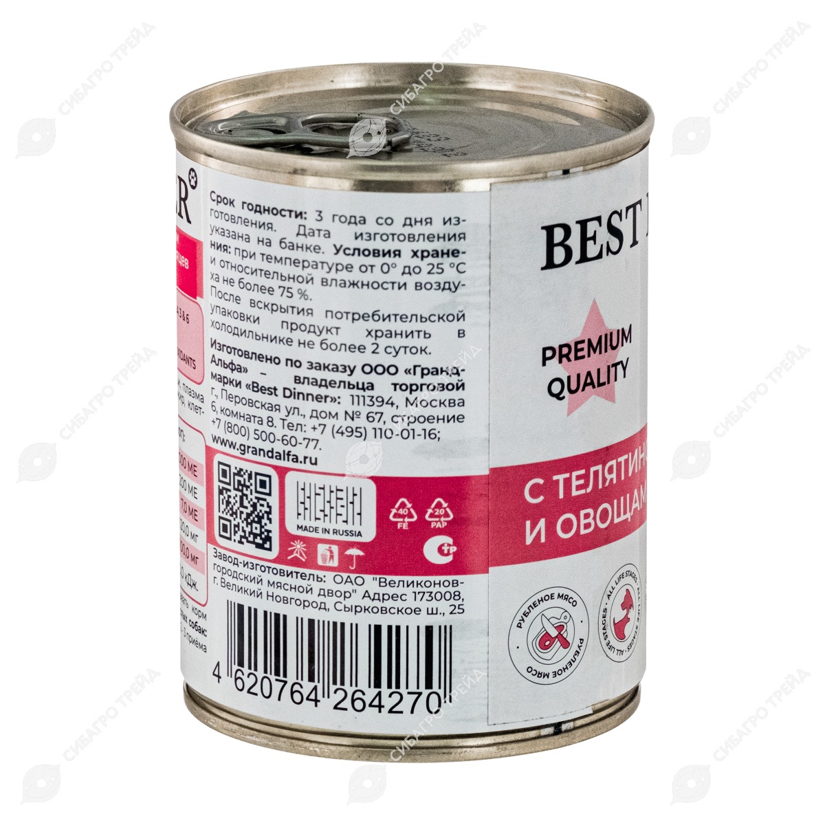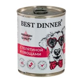Сбалансированный корм премиум-класса Best Dinner с телятиной и овощами полностью удовлетворяет потребность собаки в белках, макро- и микроэлементах Телятина – нежирное мясо, оно полностью усваивается и не вызывает аллергии, обеспечивает собаке необходимую энергию на весь день. Морковь и лук, как источник клетчатки в готовом рационе, нормализуют пищеварение, стимулируя перистальтику кишечника, насыщают организм животного микроэлементами. Рыбий жир является источником энергии и Омега-3 жирных кислот. Оптимальное содержание влаги облегчает щенкам поедание корма, помогает организму лучше усваивать витамины и минералы. Приятный мясной запах консервированного корма привлекает собак и вызывает у них аппетит.