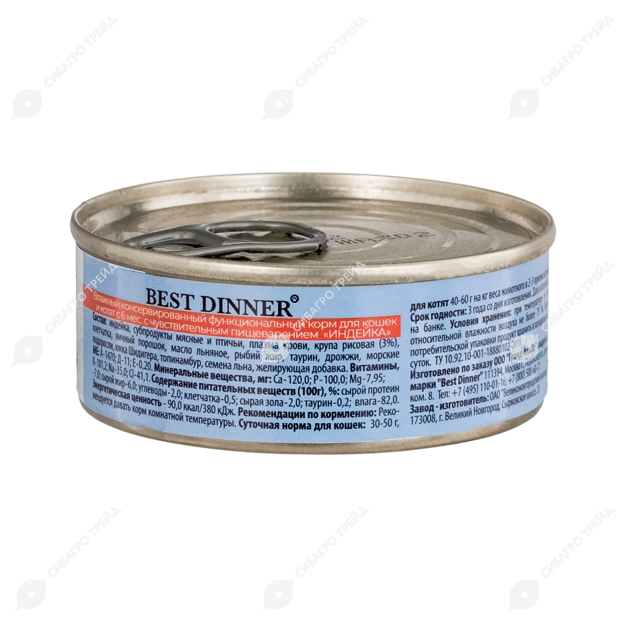 Аналитиеский состав: сырой протеин– 7,0; сырой жир– 6,0; углеводы – 2,0; влага –82,0; клетчатка - 0,5; сырая зола - 2,0; таурин – 0,2.