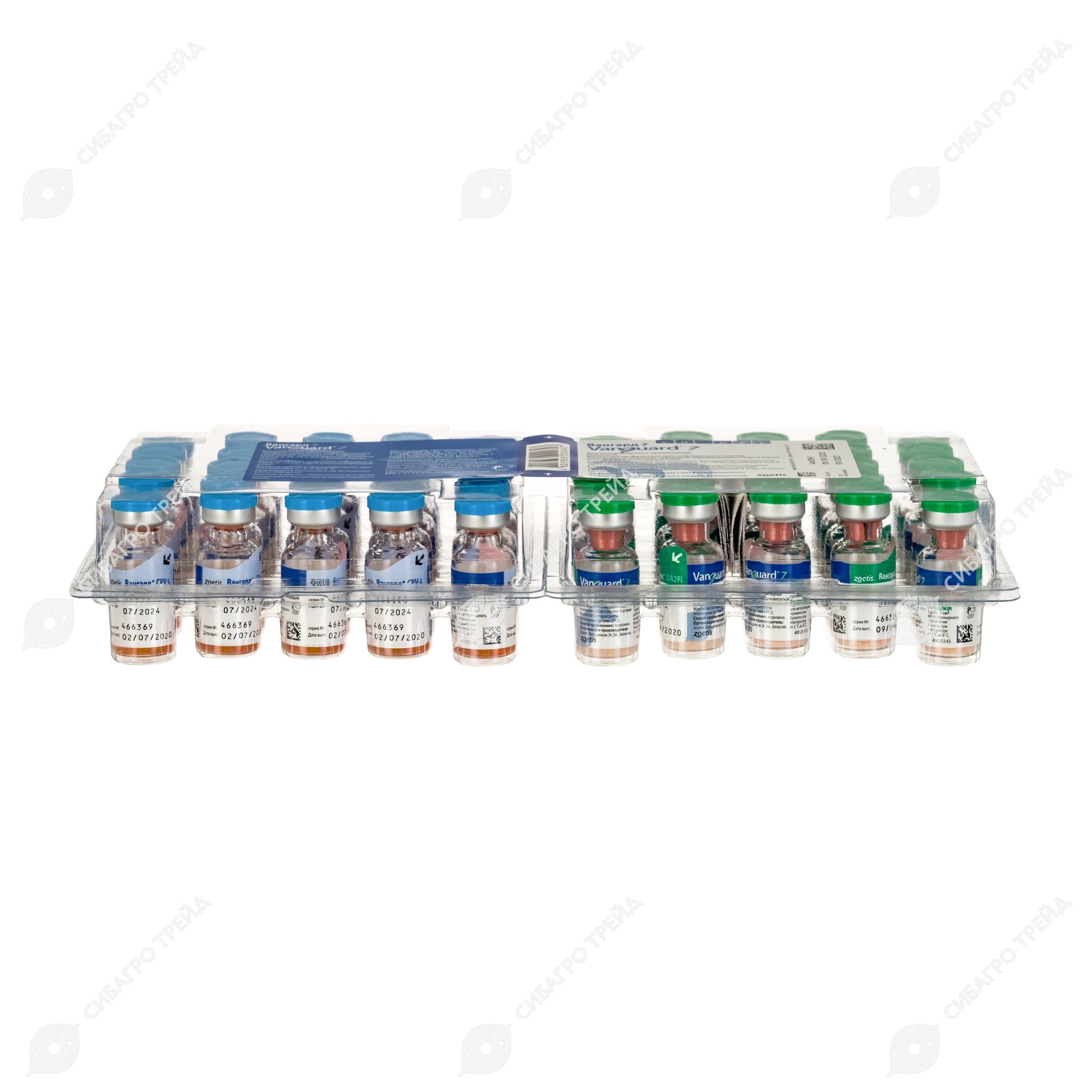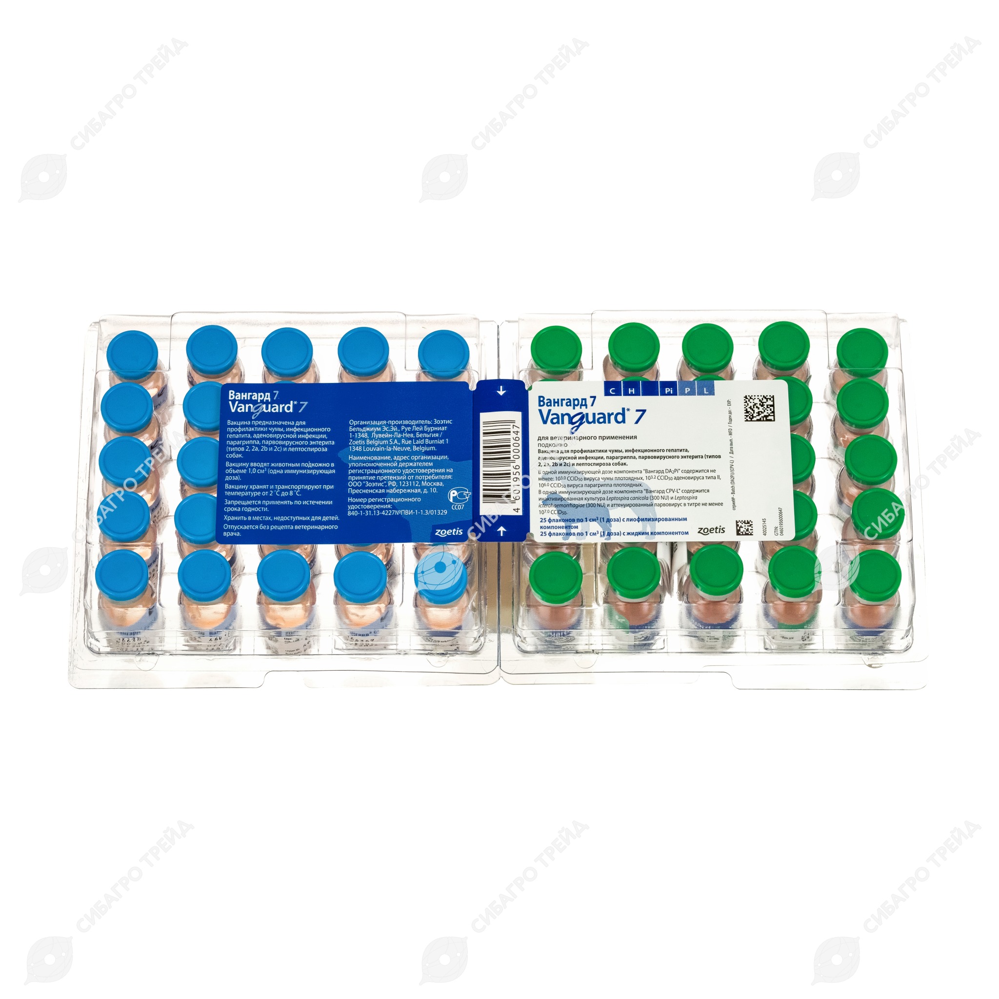 Вакцина Вангард 7 состоит из двух компонентных систем: первая Вангард DA2Pi – представляет собой лиофильно высушенную пористую массу бежевого цвета, содержащую аттенуированные штаммы вирусов в титре не менее чумы плотоядных (штамм Snyder Hill) – 3 lg ТЦД50, аденовируса типа II (штамм Manhatten) – 3,2 lg ТЦД50, парагриппа плотоядных (штамм NL-CPI-5) – 6 lg ТЦД50 c добавлением стабилизатора L2 (50% от общего объема) и среды Игла (0,85 мл ± 20%); вторая Вангард CPV-L – представляет собой гомогенную бесцветную опалесцирующую жидкость, изготовленную из лептоспир серогрупп Canicola (штамм С51) и Icterohaemorragiae (штамм NADL 11403), инактивированных тиомерсалом (0,01%), и аттенуированного парвовируса собак (штамм NL-35-D) с добавлением среды Игла до 1 мл.