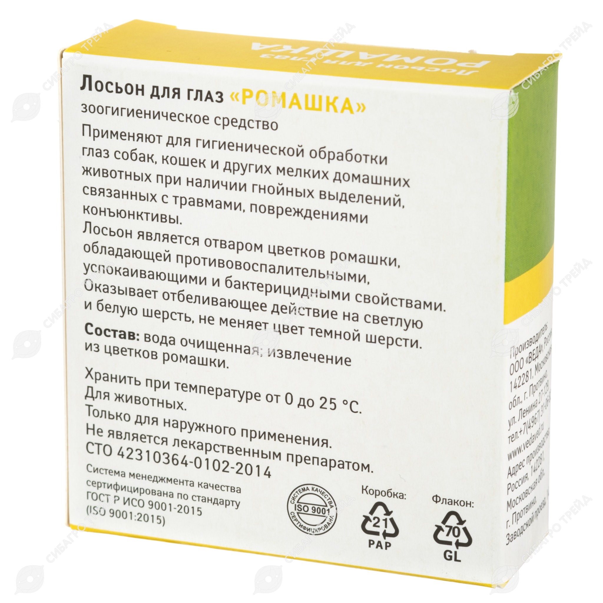 применяют для гигиенической обработки глаз собак, кошек и других мелких домашних животных при наличии гнойных выделений, связанных с травмами, повреждениями конъюнктивы. Лосьон является отваром цветков ромашки, обладающей противовоспалительными, успокаивающими и бактерицидными свойствами.
