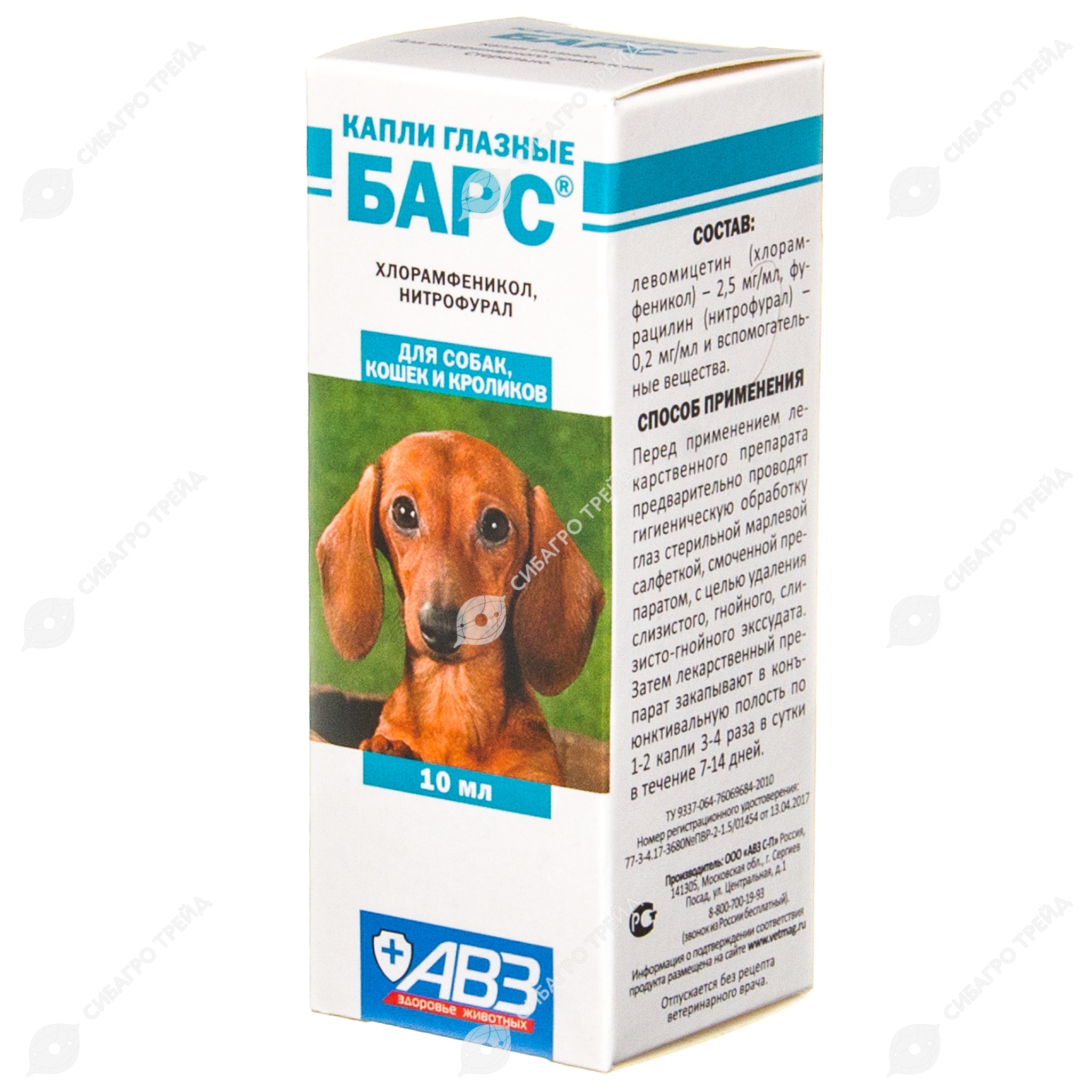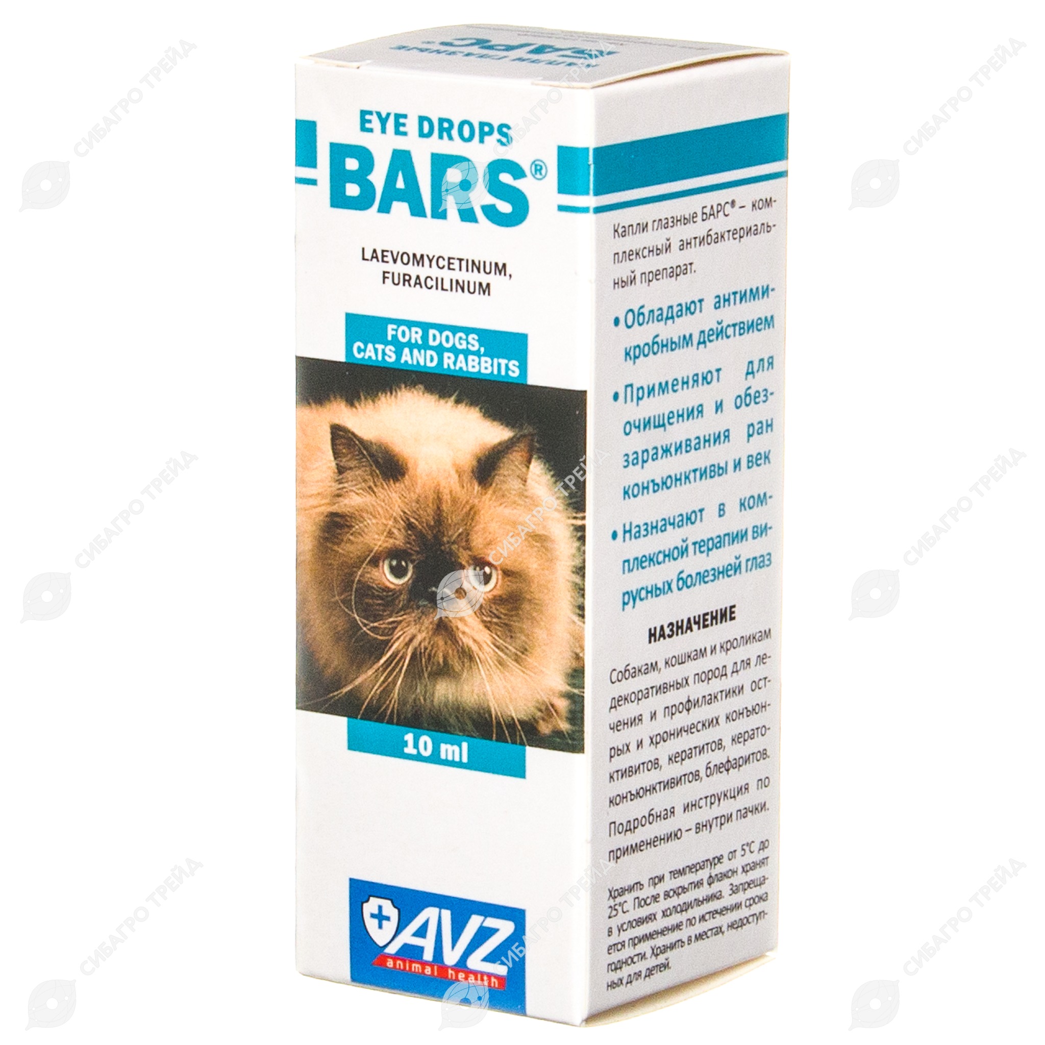 Капли глазные Барс назначают собакам, кошкам и кроликам декоративных пород для лечения и профилактики острых и хронических конъюнктивитов, кератитов, кератоконъюнктивитов и блефаритов, а также для профилактики инфекционных заболеваний глаз после травм и попадания инородных тел.