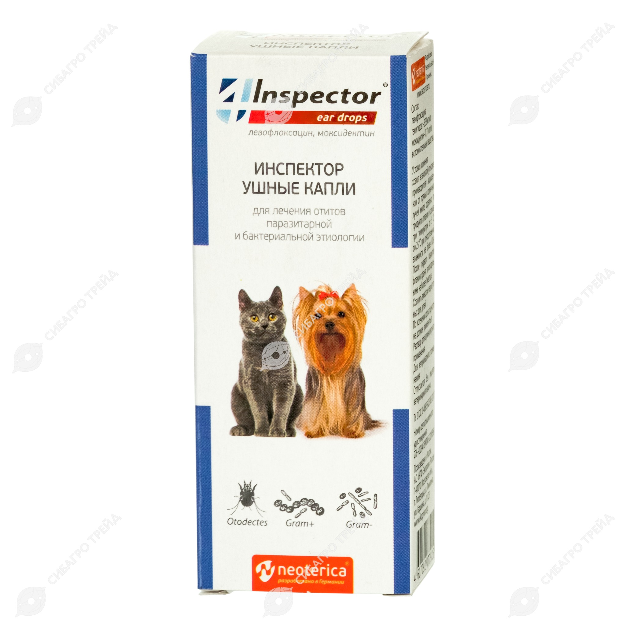 Ушные капли "Инспектор" применяют для лечения собак и кошек при отите наружного и среднего уха паразитарной и бактериальной этиологии. Лечение самых распространенных заболеваний ушей (без необходимости покупки нескольких препаратов): отодектоз (ушная чесотка), отиты бактериальной этиологии. Быстрый лечебный эффект в независимости от тяжести заболевания: Моксидектин проникает глубоко в кожу, моментально уничтожая паразитов; Левофлоксацин обеспечивает комплексный антибактериальный эффект; Салициловая кислота снимает воспаление.