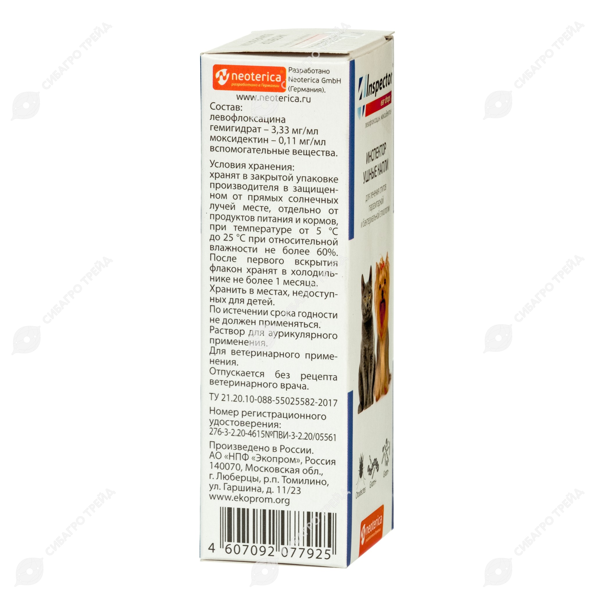 Ушные капли "Инспектор" применяют для лечения собак и кошек при отите наружного и среднего уха паразитарной и бактериальной этиологии. Противопоказанием к применению является повышенная индивидуальная чувствительность животного к входящим в его состав компонентам. Запрещается применение препарата животным при перфорации барабанной перепонки. При работе с препаратом следует соблюдать общие правила личной гигиены и техники безопасности, предусмотренные при работе с лекарственными средствами. Людям с гиперчувствительностью к компонентам препарата следует избегать прямого контакта препаратом. По окончании работы руки следует вымыть теплой водой с мылом. При случайном контакте лекарственного препарата со слизистыми, их необходимо промыть большим количеством воды. При попадании препарата внутрь необходимо промыть желудок большим количеством воды, а затем принять адсорбент. В случае появления аллергических реакций или при случайном попадании препарата в организм человека следует немедленно обратиться в медицинское учреждение (при себе иметь инструкцию по применению или этикетку). Пустые флаконы из под лекарственного препарата запрещается использовать для бытовых целей, они подлежат утилизации с бытовыми отходами. Ушные капли запрещено принимать самкам в период беременности и вскармливании детенышей, щенкам и котятам моложе 4-х месячного возраста.