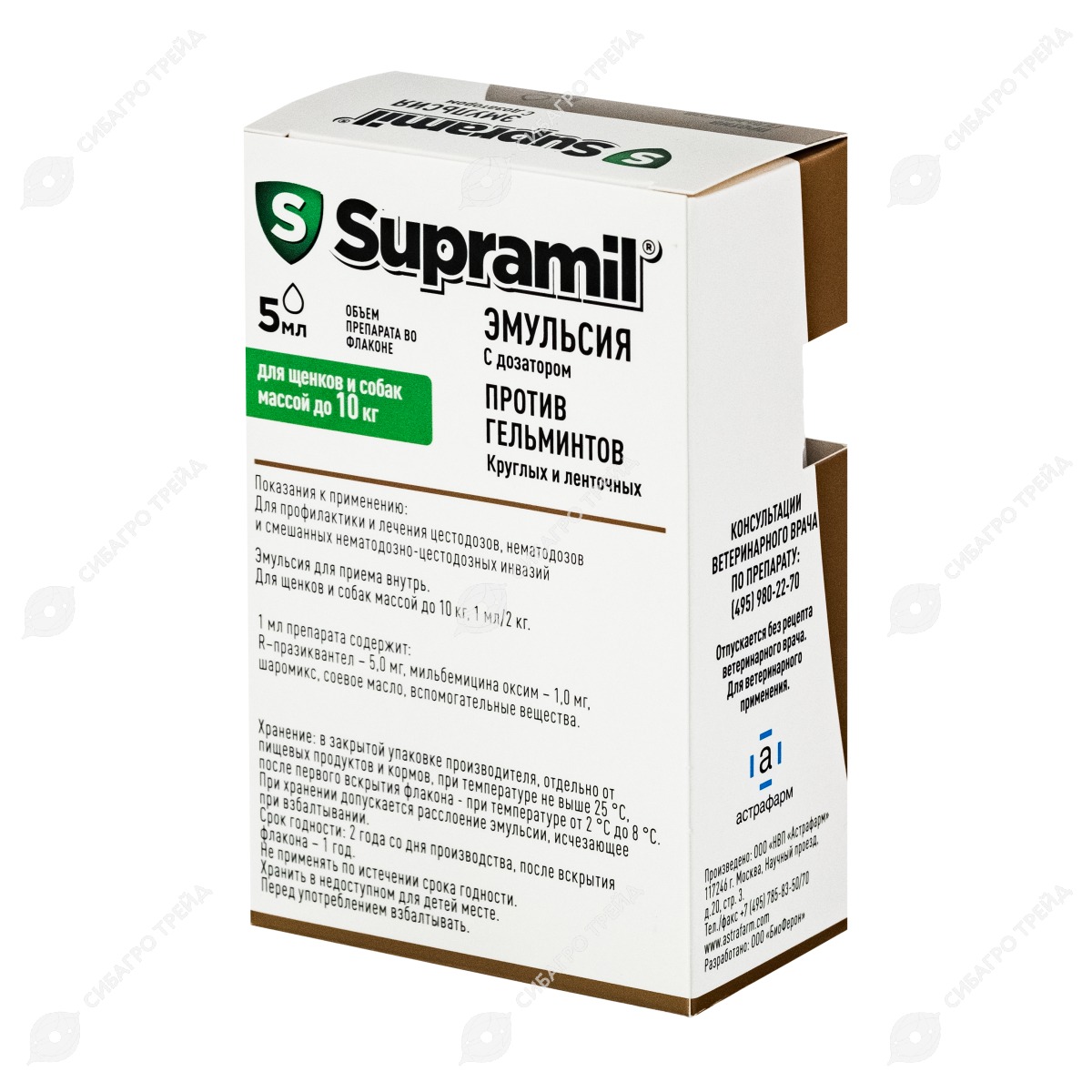 Supramil эмульсия – первая в мире антигельминтная эмульсия широкого спектра действия для собак массой до 10 кг, предназначенная для лечения и профилактики заражения круглыми и ленточными гельминтами, а также дирофиляриоза.
