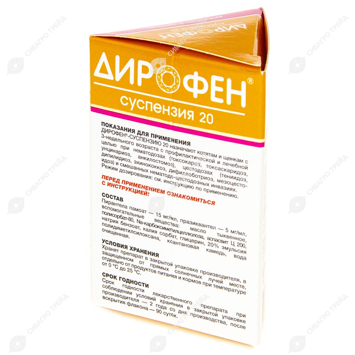 2. Лекарственная форма: суспензия для приема внутрь. Лекарственный препарат выпускают в двух дозировках: Дирофен-суспензия 20 (для котят, щенков, хорьков и декоративных грызунов) и Дирофен-суспензия 60 (для взрослых собак и кошек), содержащих в 1 мл в качестве действующих веществ соответственно: пирантела памоат — 15 мг и 45 мг и празиквантел — 5 мг и 15 мг, а также вспомогательные вещества: масло тыквенное, полисорбат-80,