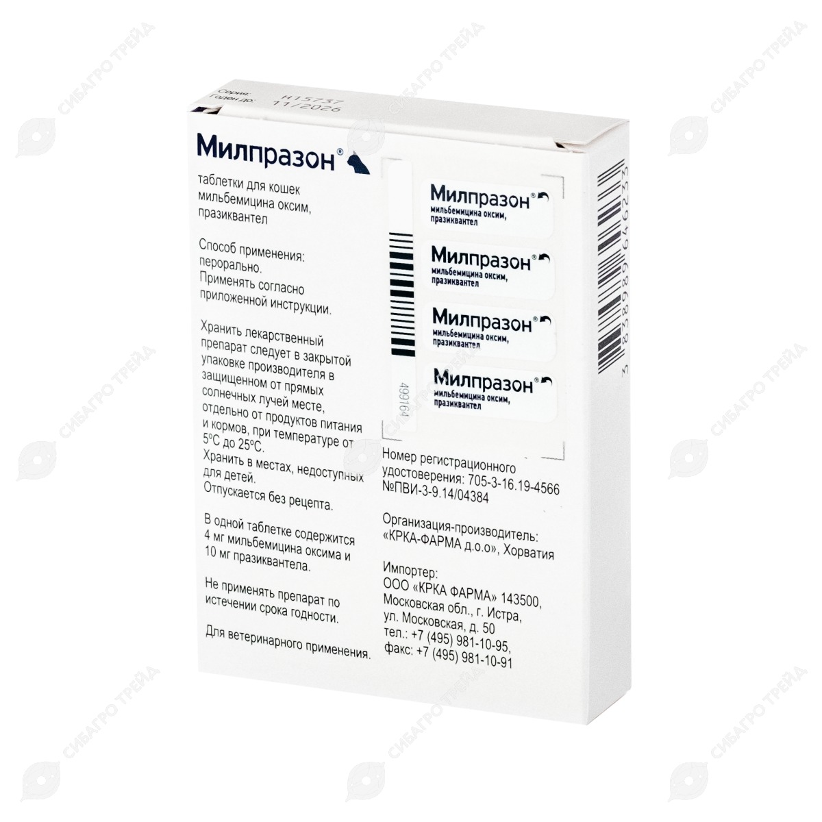 * Однократный прием Милпразона защищает кошек на 1 месяц от заражения дирофиляриями Dirofilaria immitis.