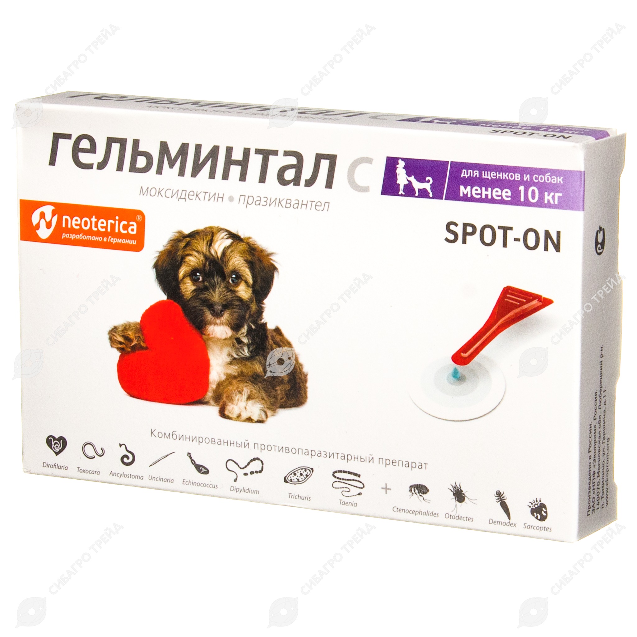 Гельминтал Spot-on для собак - препарат широкого спектра действия. Давайте препарат однократно, как с профилактической, так и с лечебной целью. Капли действуют 1 месяц.