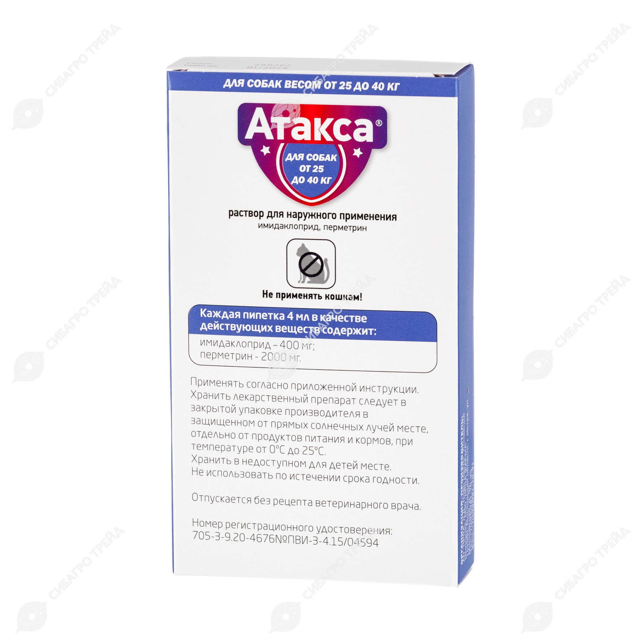 Атакса — препарат для защиты собак от укусов иксодовых клещей, блох и комаров. Обладает длительным защитным и репеллентным действием: не только уничтожает, но и отпугивает паразитов на протяжении 4 недель.