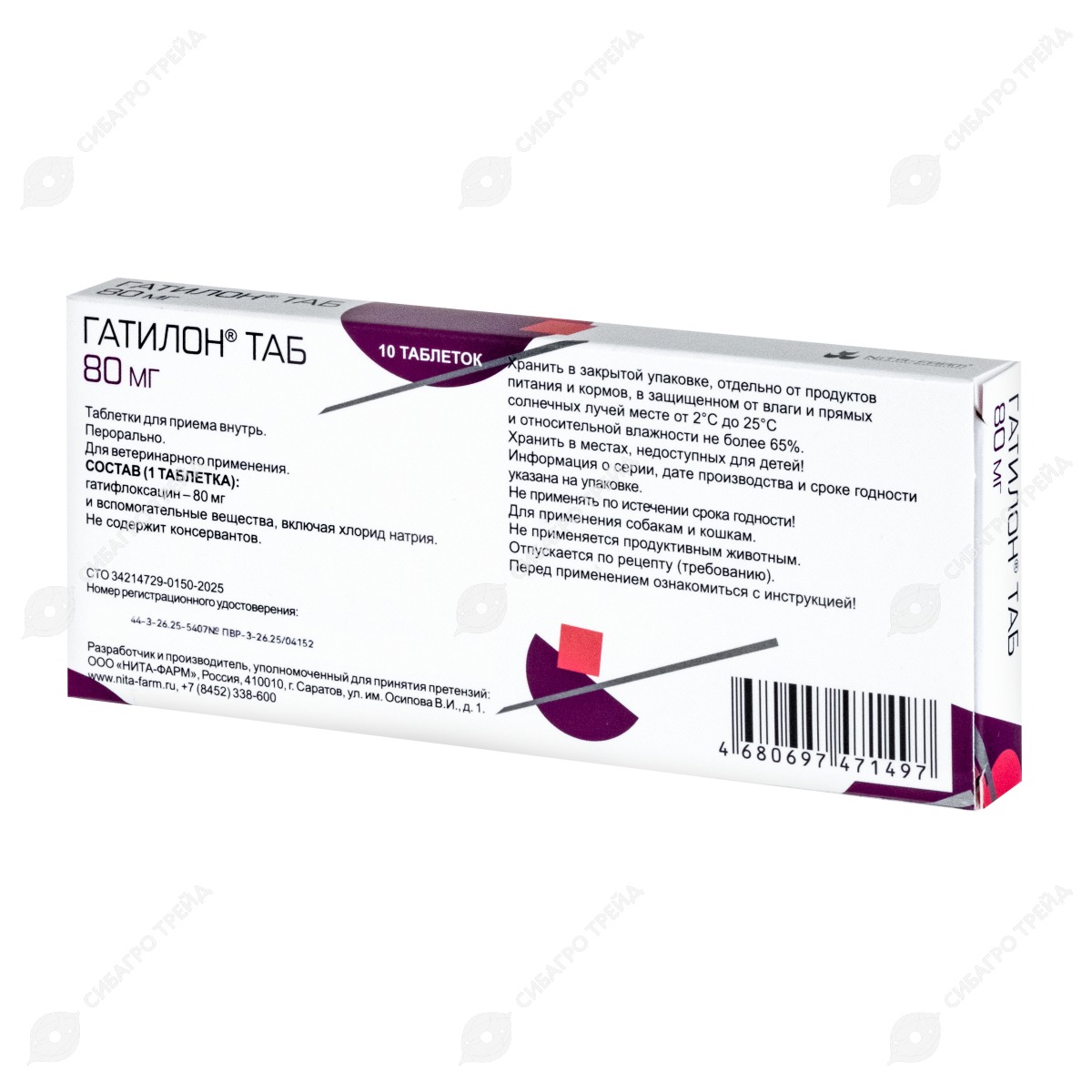 8. Гатилон ТАБ не допускается одновременно применять с препаратами, содержащими цинк, магний, алюминий, железо, из-за возможного снижения абсорбции гатифлоксацина в желудочно-кишечном тракте животного.