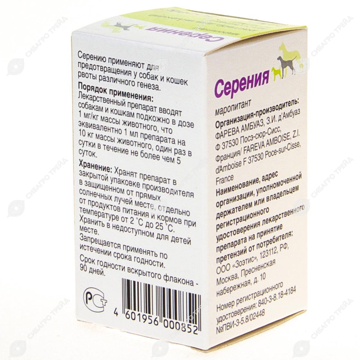 Действующее вещество Серении - маропитанта цитрат - является антагонистом нейрокининовых рецепторов (NK1) и ингибирует связывание субстанции Р, нейтропептида тахикининовой группы в ЦНС. Маропитанта цитрат эффективен при рвоте как центрального, так и периферического генеза. Маропитант быстро всасывается из места инъекции и достигает максимальной концентрации в плазме крови через 45 минут после введения. Маропитант более чем на 99% связывается с белками плазмы крови. Биодоступность Серении составляет 90%. Маропитант метаболизируется в печени цитохромом Р450, выделяется главным образом с фекалиями.