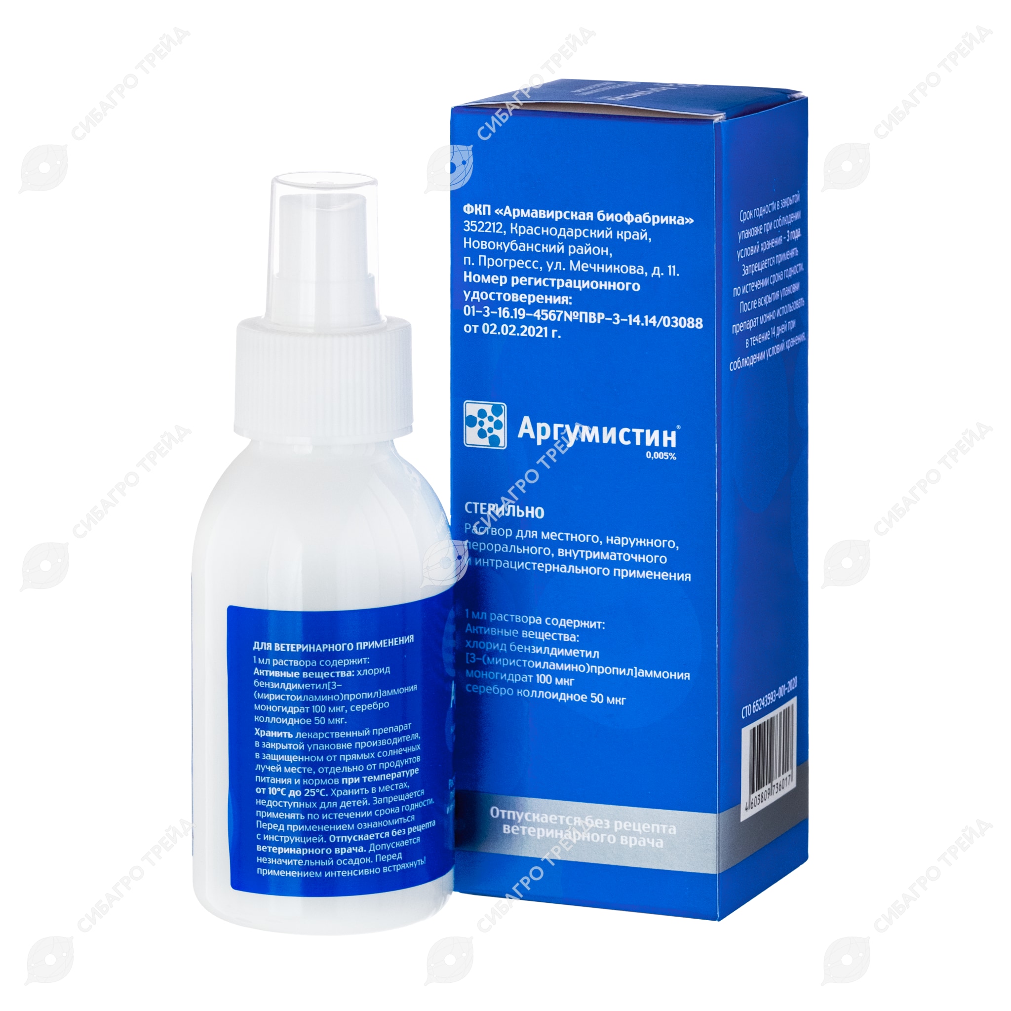 Аргумистин безболезненно воздействует на раневые поверхности животного: с его помощью можно также предварительно промыть рану, удалив механические загрязнения и отмершие ткани, а затем наложить повязку с препаратом. Благодаря совместному действию коллоидного серебра и хлорида бензилдиметил[3- (миристоиламино)-пропил]аммония способствует не только эффективной борьбе с патогенными микроорганизмами в ране, но и ускоряет снятие воспаления, отечности, процессы быстрой регенерации пораженных участков тканей.