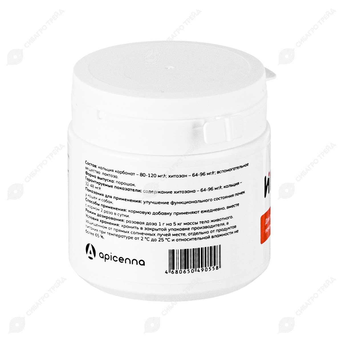 Хитозан связывает желчные кислоты в кишечнике животного, что способствует снижению уровня холестерина в сыворотке крови, а также повышает уровень гемоглобина в крови. Структура хитозана способствует снижению всасываемости индоксил сульфата, снижает уровень реактивного окислительного стресса, мочевины и креатинина в сыворотке крови. Карбонат кальция при поступлении в организм образует прочные нерастворимые соединения с фосфатами корма, помогает поддерживать баланс кальциево-фосфорного обмена в организме. Применение кормовой добавки нормализует обменные процессы и способствует улучшению функционального состояния почек животных.