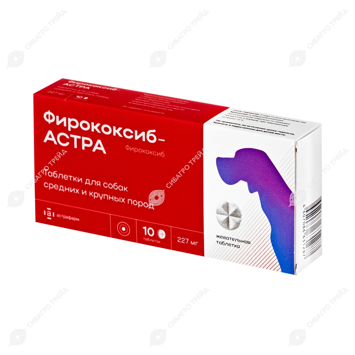 - Фирококсиб-АСТРА таблетки для собак средних и крупных пород (масса таблетки 950 мг) - 227 мг фирококсиба на таблетку.