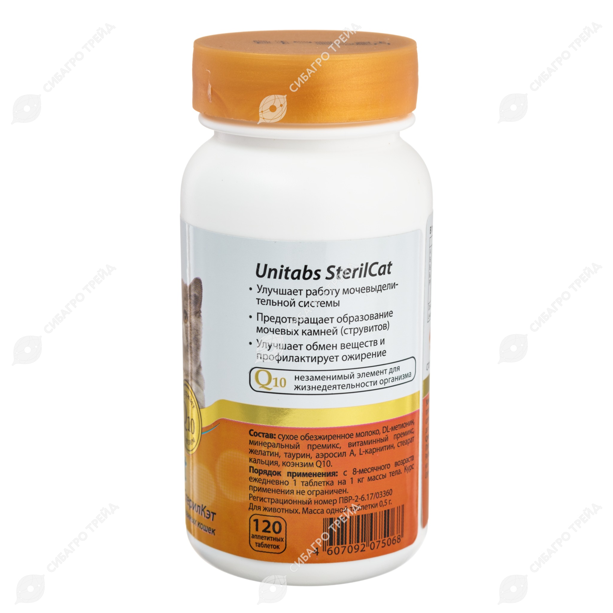 Unitabs SterilCat — это витаминно-минеральный комплекс для кастрированных котов и стерилизованных кошек, который содержит коэнзим Q10 и все необходимые витамины, макро- и микроэлементы.