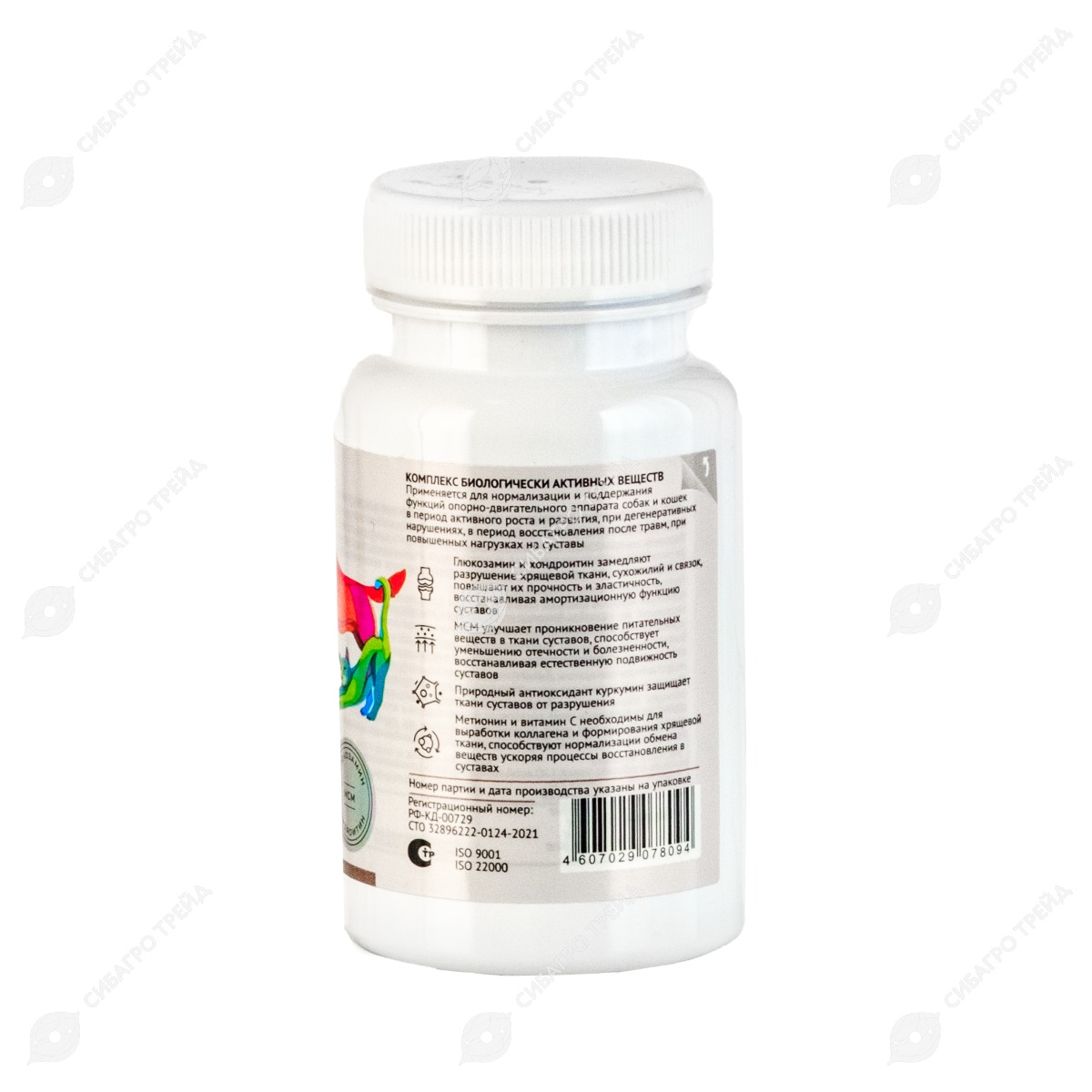 Глюкозамин и хондроитин (хондропротекторы), метилсульфонилметан (МСМ), водорастворимые витамины: С, аминокислоты: метионин, биологически активные компоненты: куркумин (природный антиоксидант), основа таблетки: пивные дрожжи.