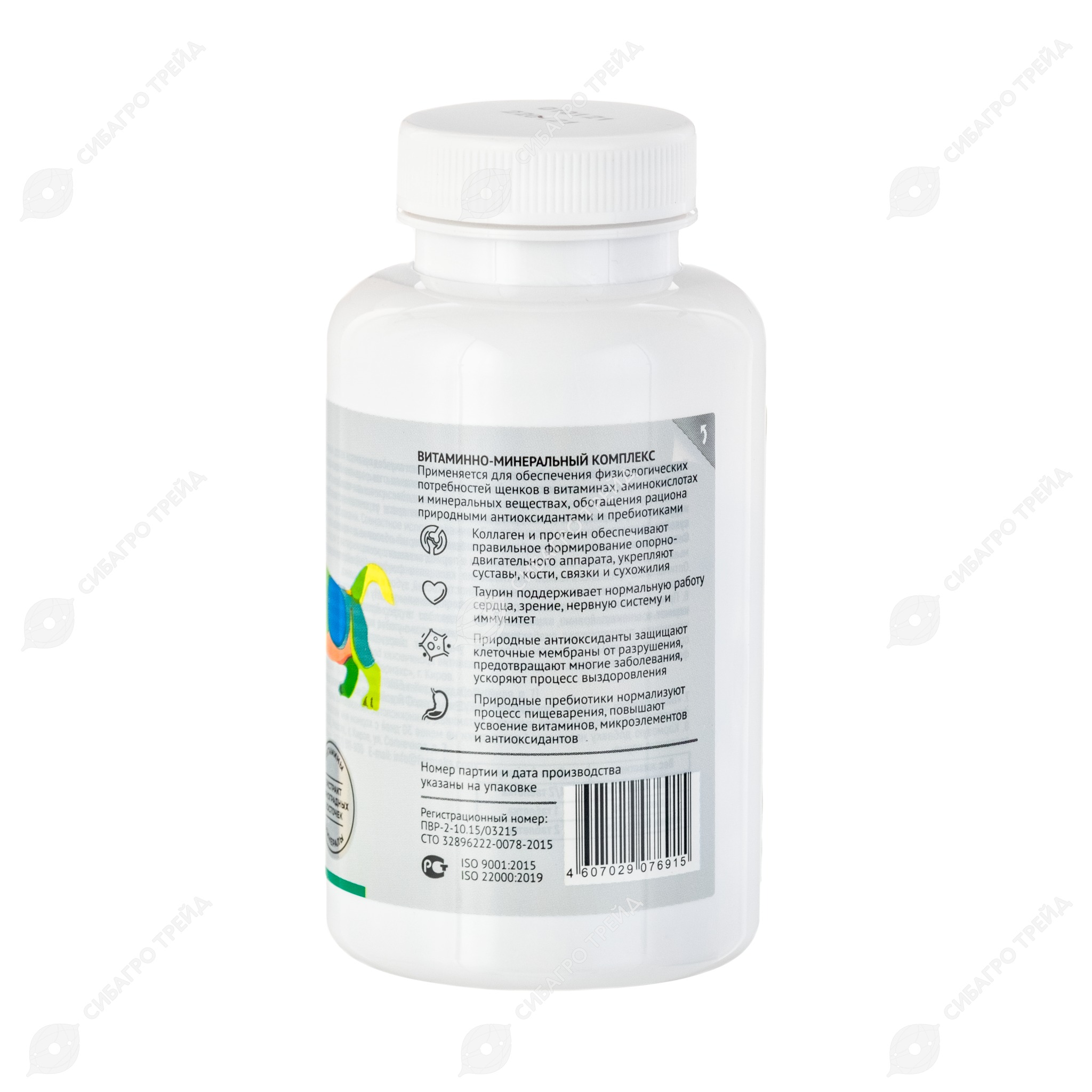 Витаминно-минеральный комплекс для обеспечения физиологических потребностей щенков в витаминах, аминокислотах и минеральных веществах, обогащения рациона природными антиоксидантами и пребиотиками.
