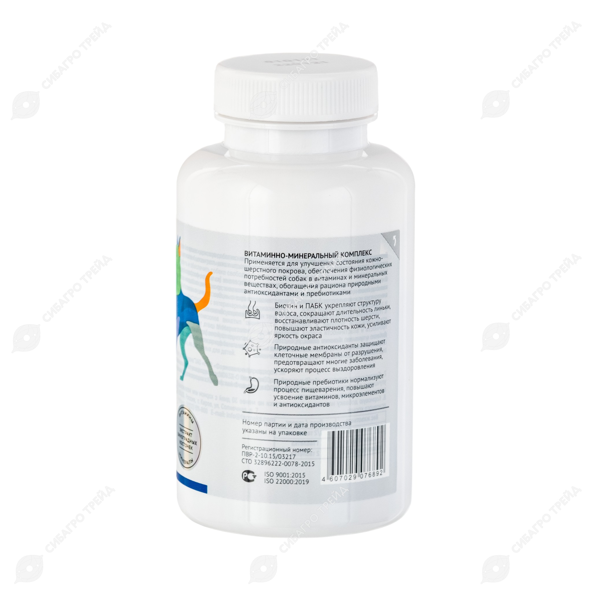 Витаминно-минеральный комплекс для улучшения состояния кожно-шерстного покрова, обеспечения физиологических потребностей собак в витаминах, аминокислотах и минеральных веществах, обогащения рациона природными антиоксидантами и пребиотиками.