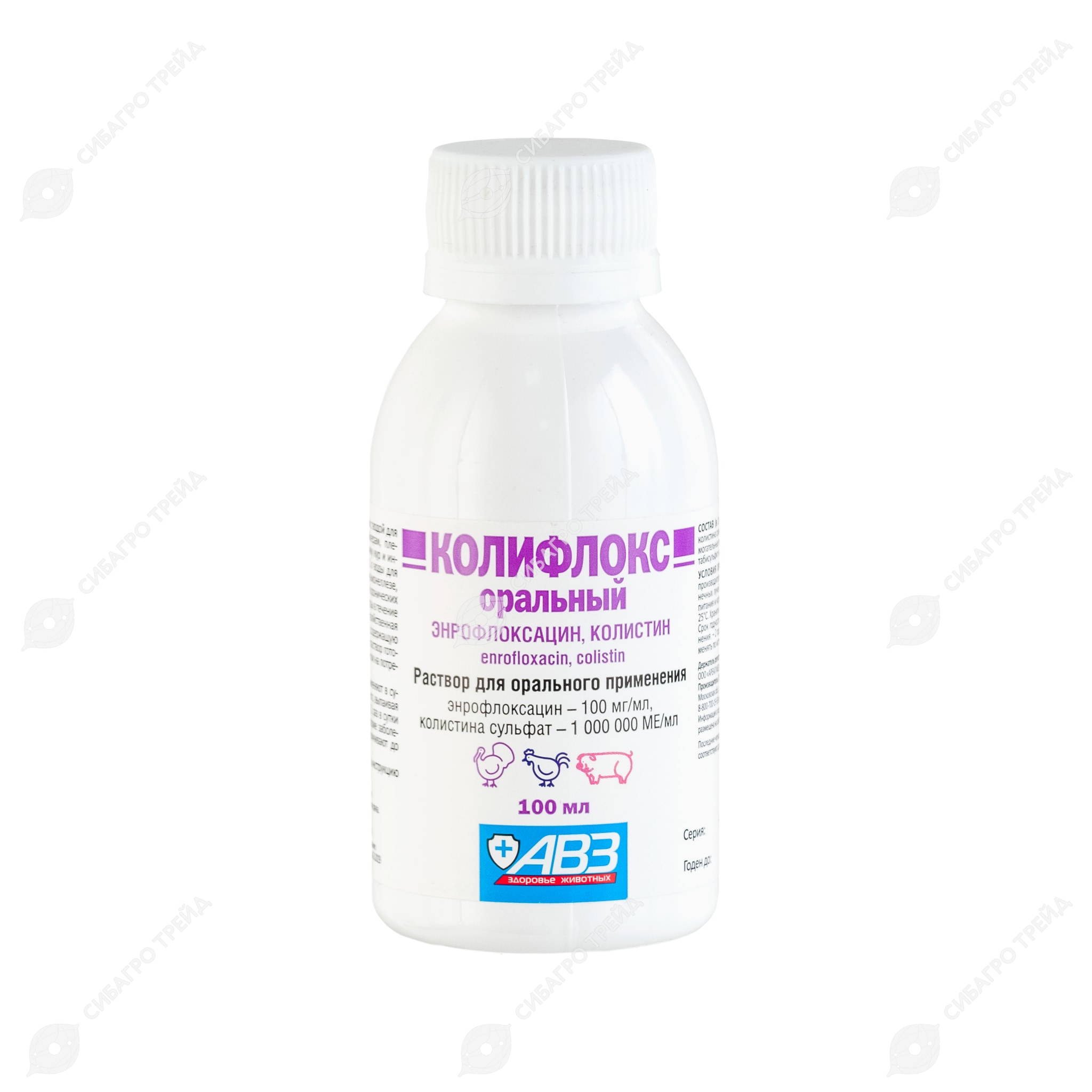 С лечебной и профилактической целью сельскохозяйственной птице при колибактериозе, сальмонеллезе, хронических респираторных заболеваниях, стрептококкозе, некротическом энтерите, гемофилезе, микоплазмозе, смешанных инфекциях и вторичных инфекциях при вирусных болезнях; поросятам - при колибактериозе и энтеритах бактериальной этиологии, возбудители которых чувствительны к энрофлоксацину и колистину.