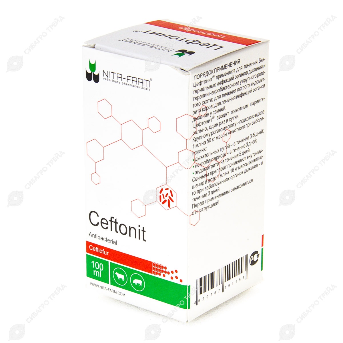 11. Цефтонит® применяют с лечебной целью: крупному рогатому скоту при бактериальных инфекциях органов дыхания, вызываемых Pasteurella haemolytica, Pasteurella multocida, Haemophilus somnus, некробактериоза, ассоциированного с Fusobacterium necrophorum и Porphiromonas assacharolytica (Bacteroides melaninogenicus), и острого эндометрита, свиньям при инфекциях органов дыхания, вызываемых Pasteurella haemolytica, Pasteurella multocida, Actinobacillus pleuropneumoniae и Streptococcus suis.