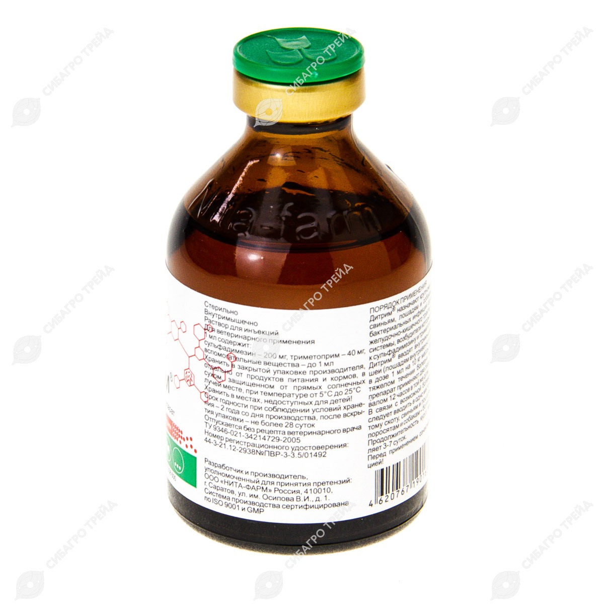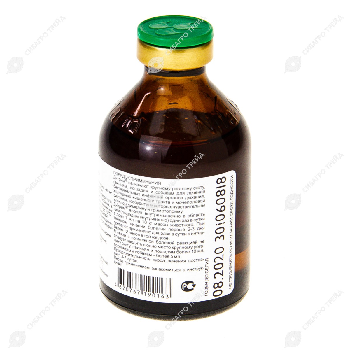 Препарат Дитрим® вводят внутримышечно в область шеи (лошадям внутривенно) один раз в сутки в дозе 1 мл на 10 кг массы животного. При тяжелом течении болезни первые 2 – 3 дня препарат применяют два раза в сутки с интервалом 12 часов в той же дозе.