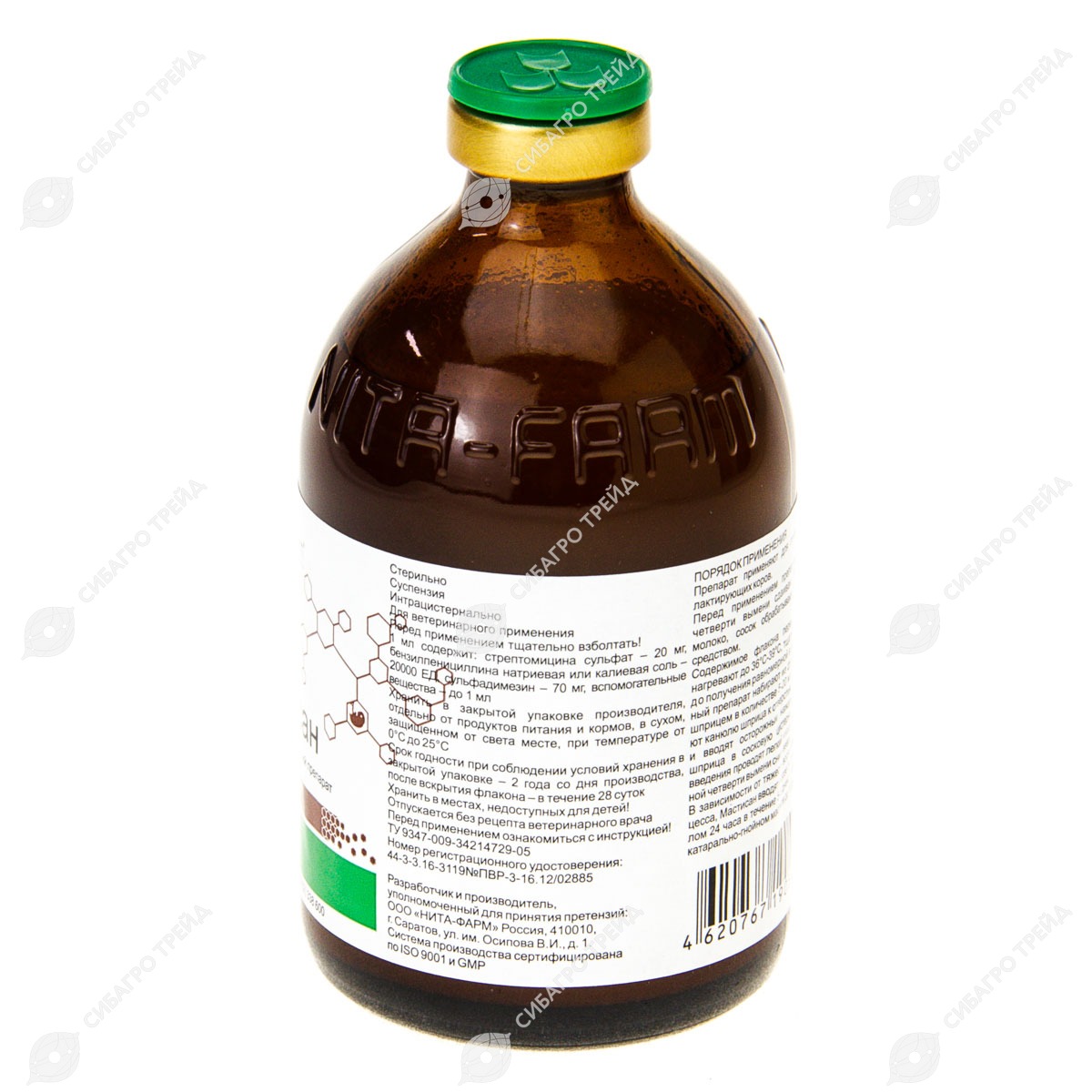 Лекарственный препарат набирают из флакона стерильным шприцем в количестве 5-20 мл, плотно прижимают канюлю шприца к отверстию соскового канала и вводят осторожным нажатием на поршень шприца в сосковую цистерну вымени.