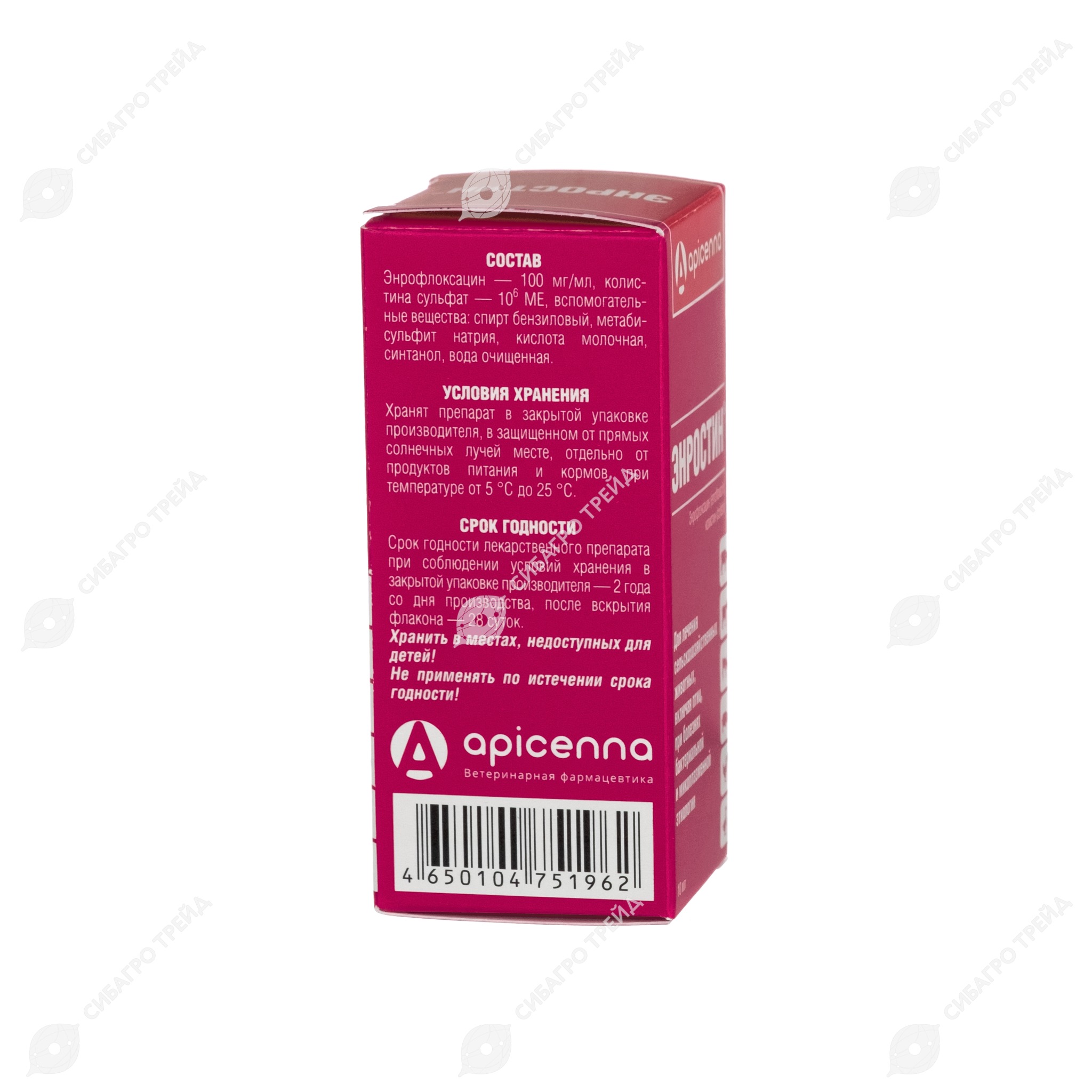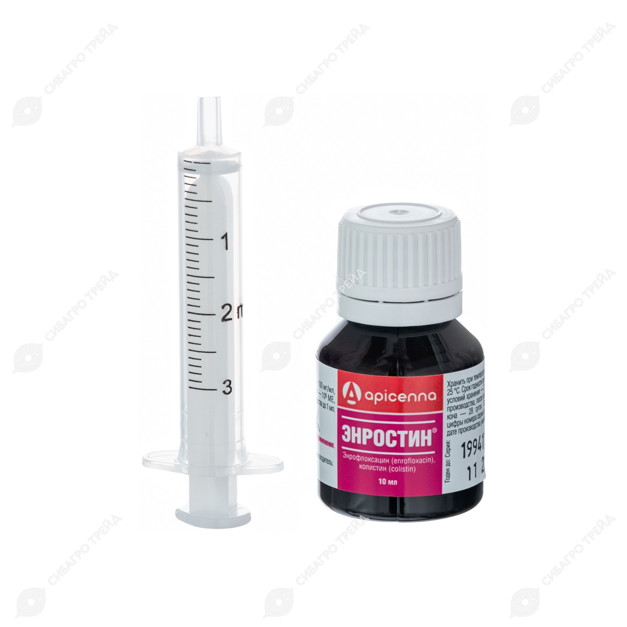 Энростин в качестве действующих веществ в 1 мл содержит: энрофлоксацин – 100 мг и колистина сульфат – 106 MЕ, а также вспомогательные вещества: спирт бензиловый, метабисульфит натрия, кислоту молочную, синтанол и воду очищенную.
