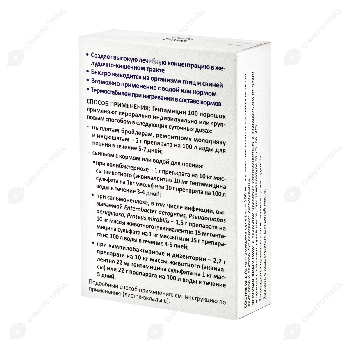 - при кампилобактериозе и дизентерии – 2,2 г препарата на 10 кг массы животного (эквивалентно 22 мг гентамицина сульфата на 1 кг массы) или 22 г препарата на 100 л воды в течение 5 дней.