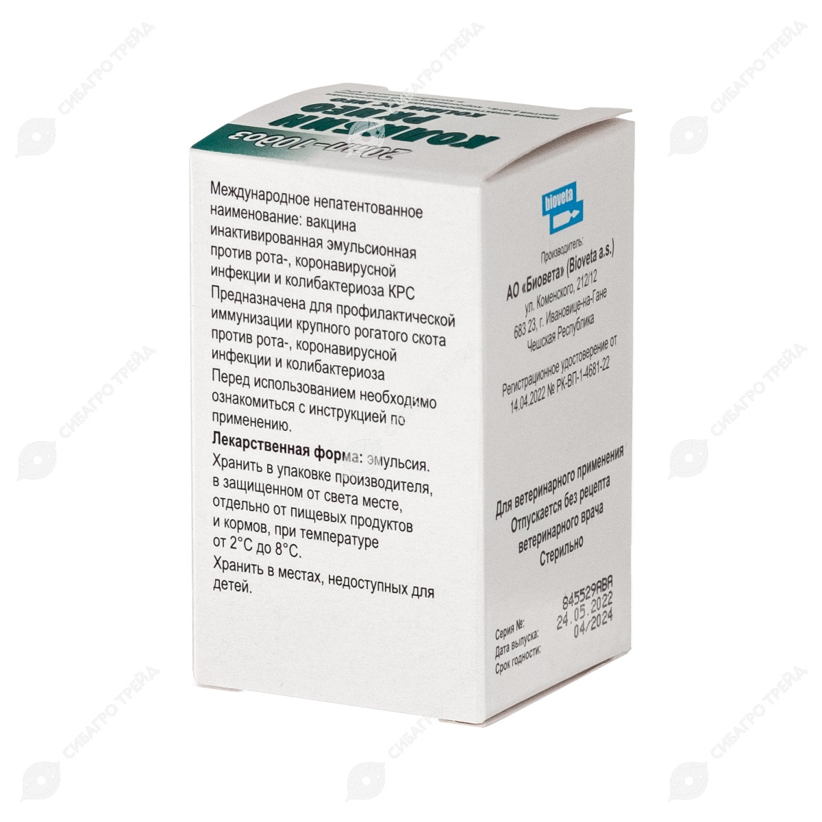 Международное непатентованное наименование: вакцина инактивированная эмульсионная против рота-, коронавирусной инфекции и колибактериоза КРС.