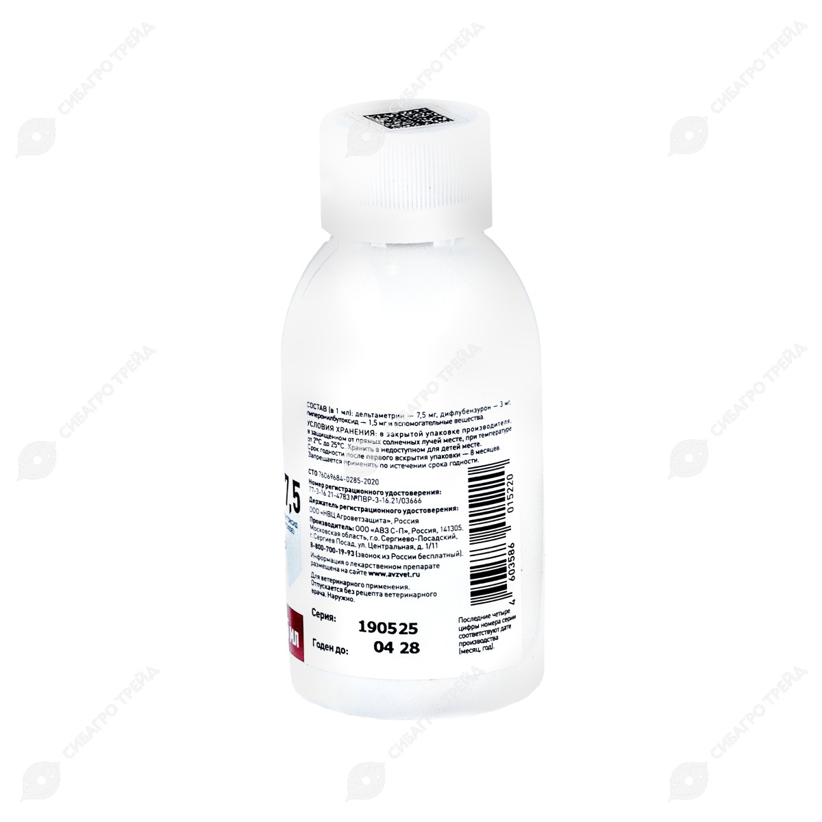 Лекарственное средство для наружного применения в качестве действующего вещества содержит синтетический пиретроид дельтаметрин – 4,0%. Дельтаметрин обладает выраженным инсектоакарицидным кишечным и контактным действием. Активен в отношении саркоптоидных, иксодовых и куриных клещей, постельных клопов, пухопероедов, вшей, блох, мух, слепней, комаров и других эктопаразитов животных.