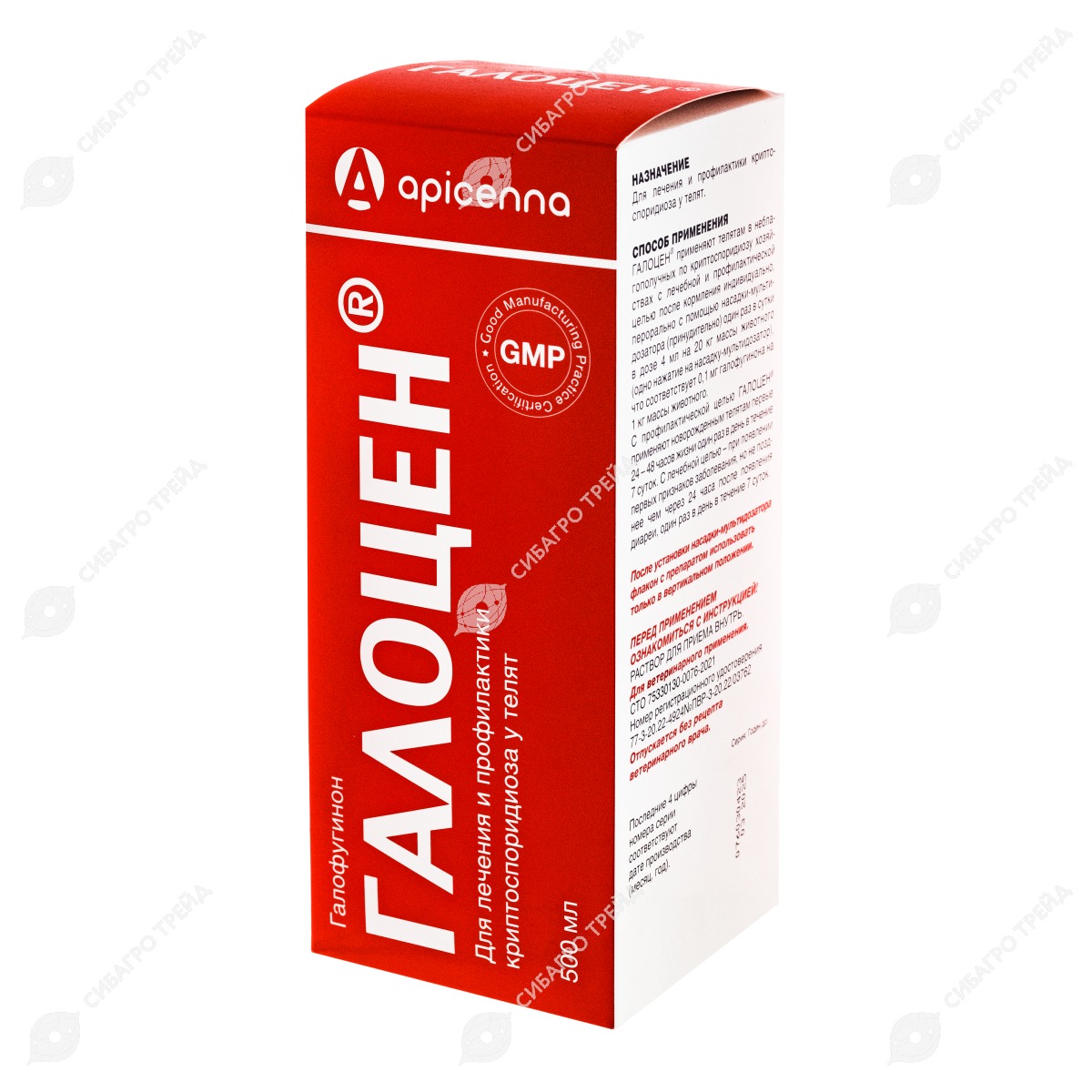 Галоцен применяют телятам строго после кормления, перорально индивидуально с помощью шприца или выпаивают с индивидуальной порцией молозива (молока, ЗЦМ) в дозе 1 мл на 5 кг массы животного (соответствует 0,1 мг/кг галофугинона один раз в сутки в течение 7 дней.