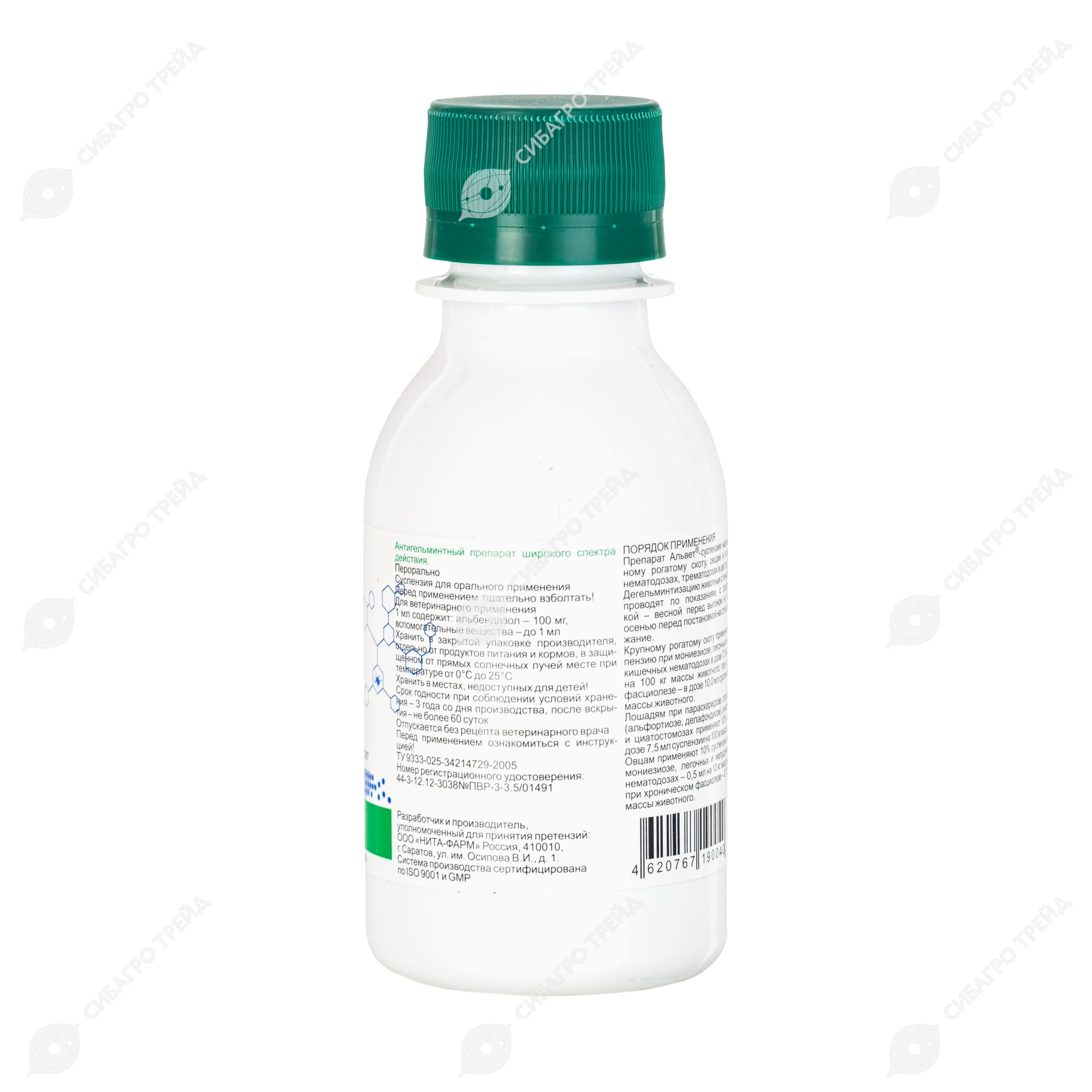Крупному рогатому скоту препарат назначают индивидуально в виде 10%-ной суспензии при мониезиозе, легочных и желудочно-кишечных нематодозах в дозе 7,5 мл/ 100 кг, при хроническом фасциолезе – 10 мл/100 кг массы животного, что составляет соответственно 7,5 мг/кг и 10 мг/кг альбендазола.