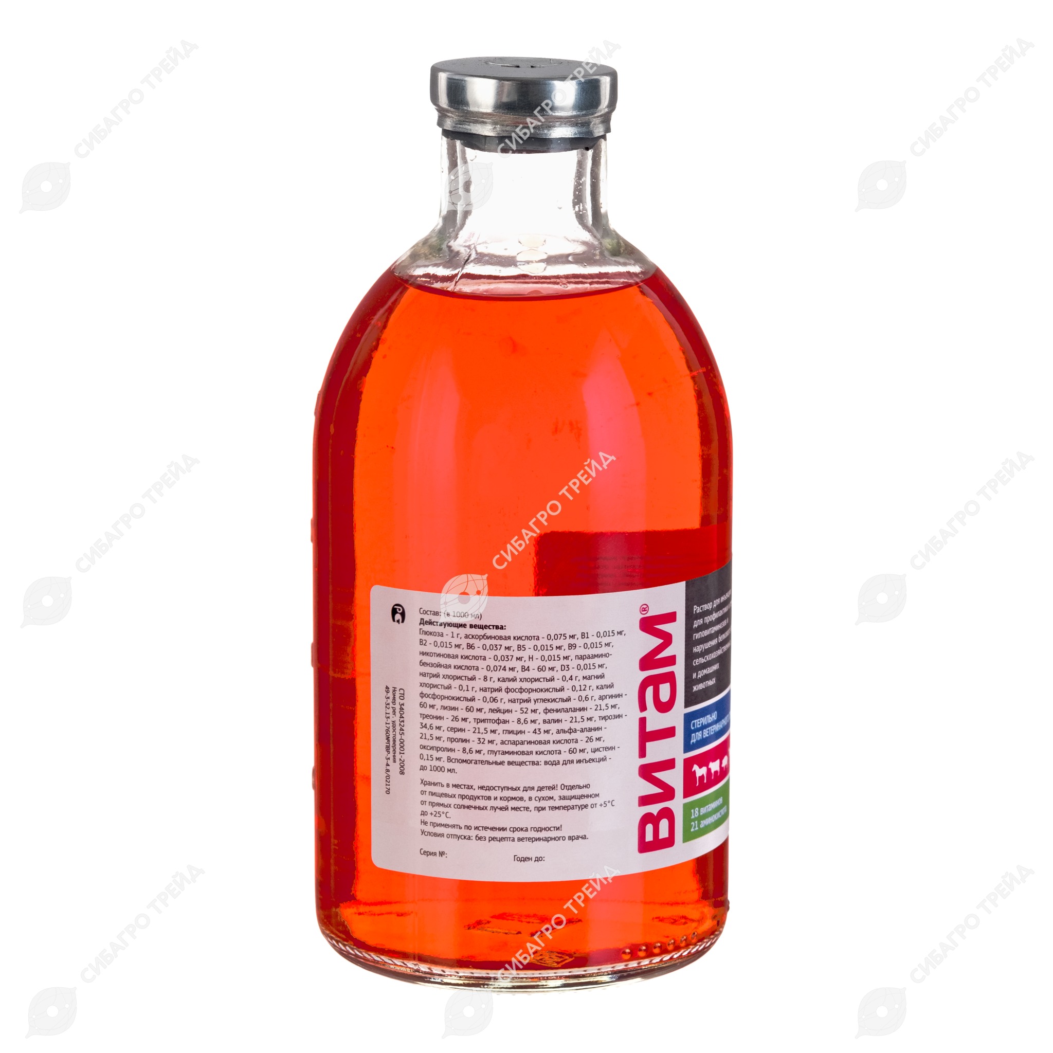 Витаминно-аминокислотный комплекс «Витам» в 1000 мл содержит глюкозу — 1 г; аскорбиновую кислоту — 0,075 мг; витамин В1 — 0,015 мг; витамин В2 —0,015 мг; витамин В3 — 0,015 мг; витамин В6 — 0,037 мг; фолиевую кислоту — 0,015 мг; никотиновую кислоту — 0,037 мг; никотинамид — 0,037 мг; биотин — 0,015 мг; парааминобензойную кислоту — 0,074 мг; холин хлорид — 60 мг; витамин D3 — 0,015 мг; натрий хлористый — 0,8 г; калий хлористый — 0,4 г; магний хлористый — 0,1 г; натрий фосфорнокислый — 0,075 г; калий фосфорнокислый — 0,06 г; натрий углекислый — 0,6 г; аргинин — 60 мг; лизин — 60 мг; лейцин — 52 мг; фенилаланин — 21,5 мг; треонин — 26 мг; триптофан — 8,6 мг; валин — 21,5 мг; тирозин — 34,6 мг; серин — 21,5 мг; глицин — 43 мг; альфа-аланин — 21,5 мг; пролин — 32 мг; аспарагиновую кислоту — 26 мг; оксипролин — 8,6 мг; глутаминовую кислоту — 60 мг; цистеин — 0,15 мг, а также в качестве растворителя воду для инъекций. По внешнему виду представляет собой прозрачную жидкость красно-оранжевого цвета. Выпускают в виде стерильного раствора расфасованного в стеклянные флаконы по 10 мл. Упаковывают в картонные коробки по 10 флаконов.