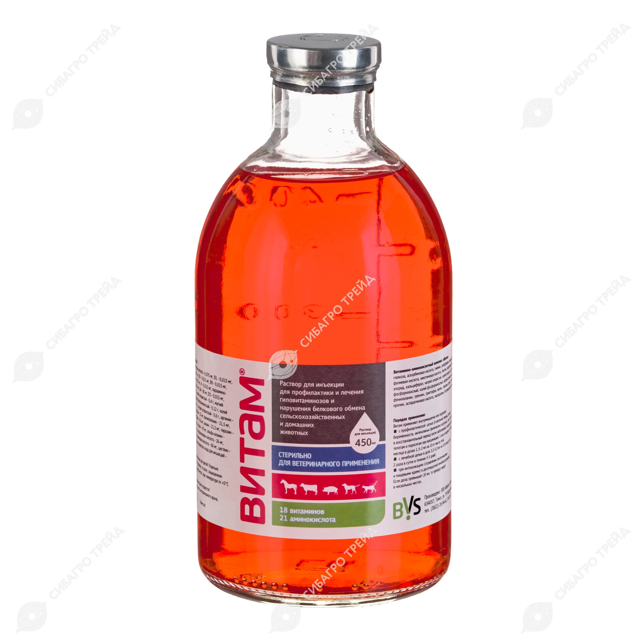 Витаминно-аминокислотный комплекс «Витам», благодаря наличию сбалансированного количества витаминов, аминокислот, микроэлементов и глюкозы, компенсирует дефицит этих биологически активных веществ в организме животных, возникающий при стрессах, профилактических прививках и дегельминтизации, после перенесенных заболеваний, способствует нормализации обмена веществ у животных. Глюкоза является источником энергии, улучшает дезинтоксикационную функцию печени, усиливает сократительную деятельность сердечной мышцы. Применение препарата стимулирует процессы кроветворения, окислительно-восстановительные реакции, нормализует обмен веществ, повышает неспецифическую резистентность организма. По степени воздействия на организм витаминно-аминокислотный комплекс «Витам» относится к малоопасным веществам (4 класс опасности по ГОСТ 12.1.007-76), в рекомендуемых дозах хорошо переносится животными, не обладает местнораздражающими, эмбриотоксическими и тератогенными свойствами.