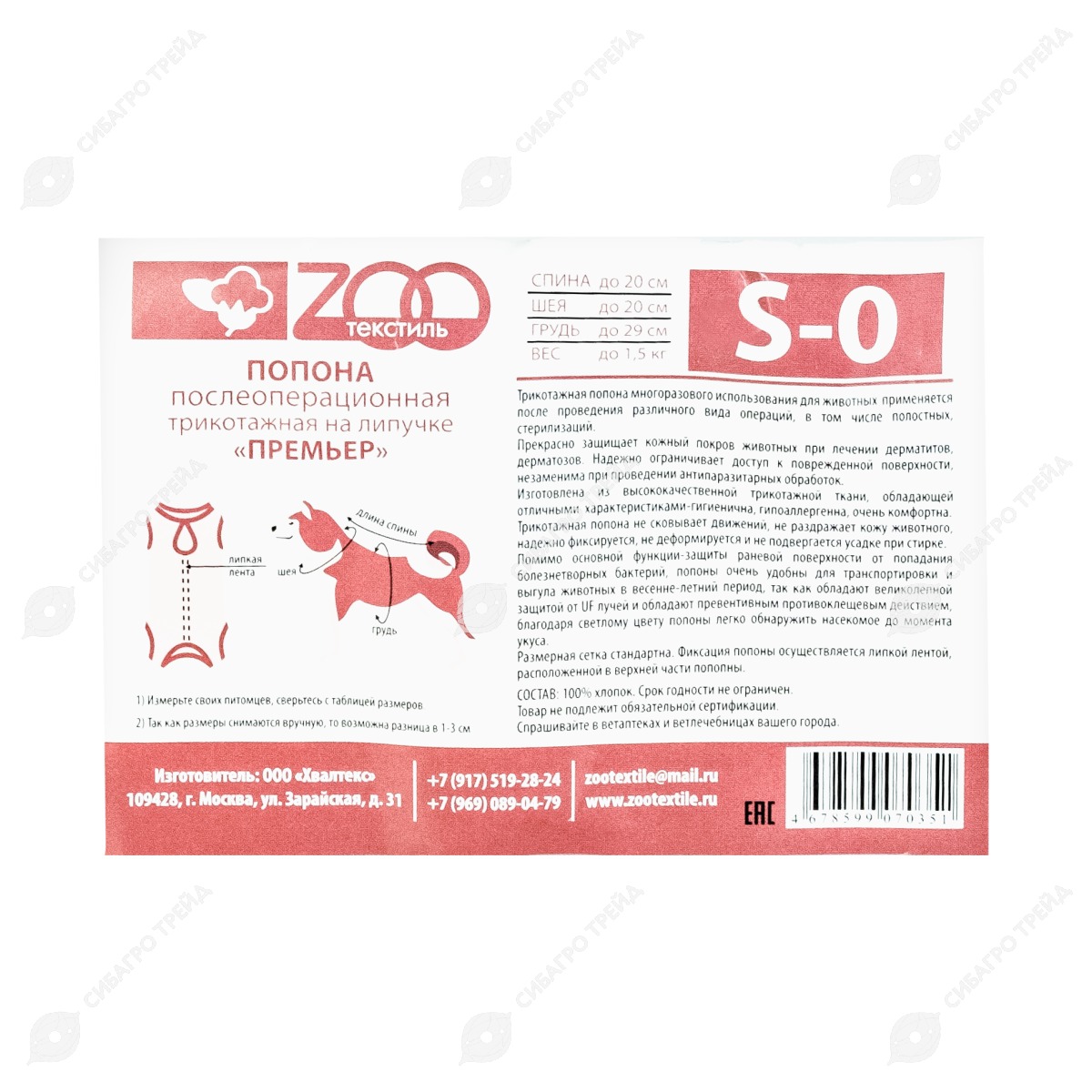 Попонка послеоперационная ПРЕМЬЕР трикотаж на липучке для кошек и собак №0 S