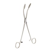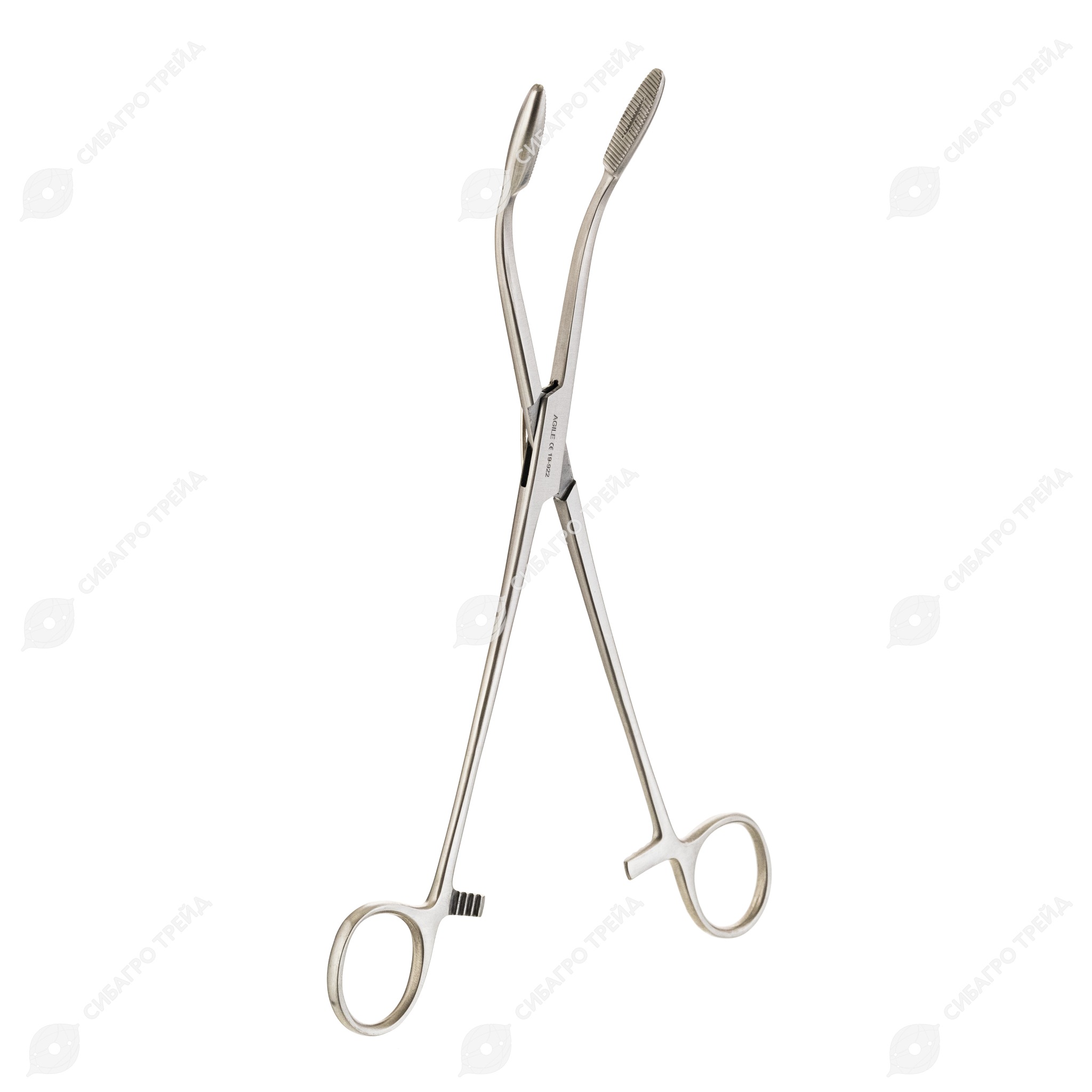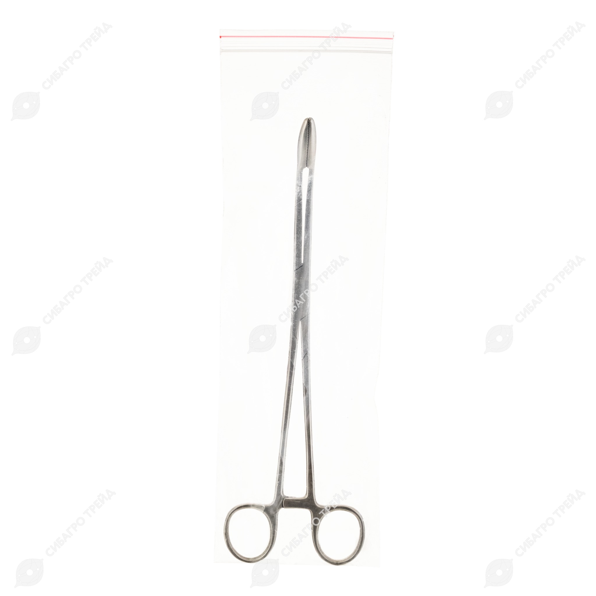 Корнцанг прямой 260 мм П-Щ-20-1 - это хирургический инструмент для захватывания и подачи стерильных инструментов и перевязочного материала, представляющий собой зажим с кремальерой, длинными прямыми или изогнутыми браншами и овальными губками с насечкой.