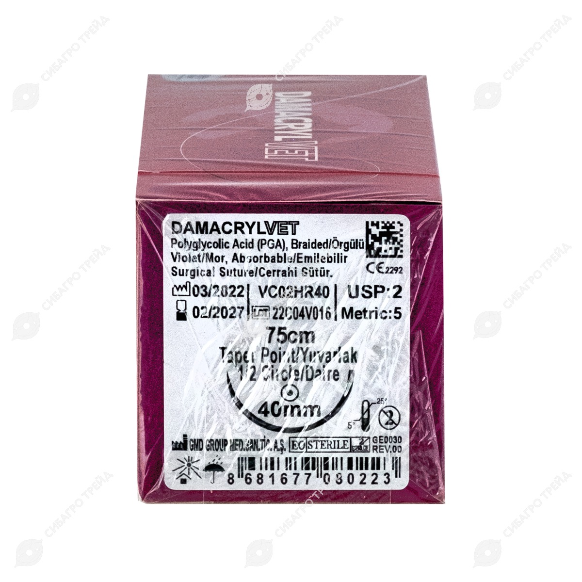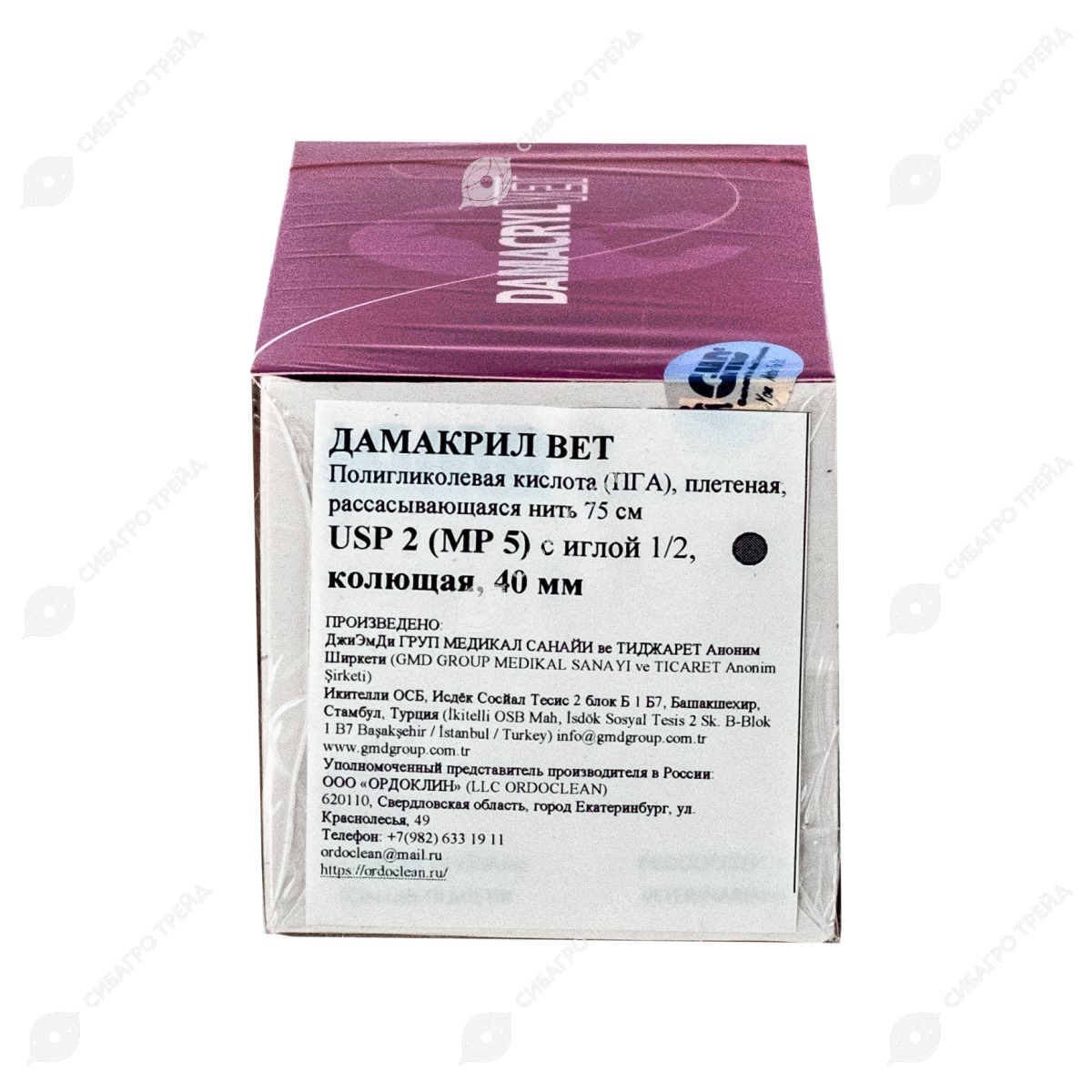 DAMACRYL (ПГА) плетеная рассасывающаяся нить (1 * 75 см, 2) с иглой 40 мм, 1/2, колющая, 12 шт