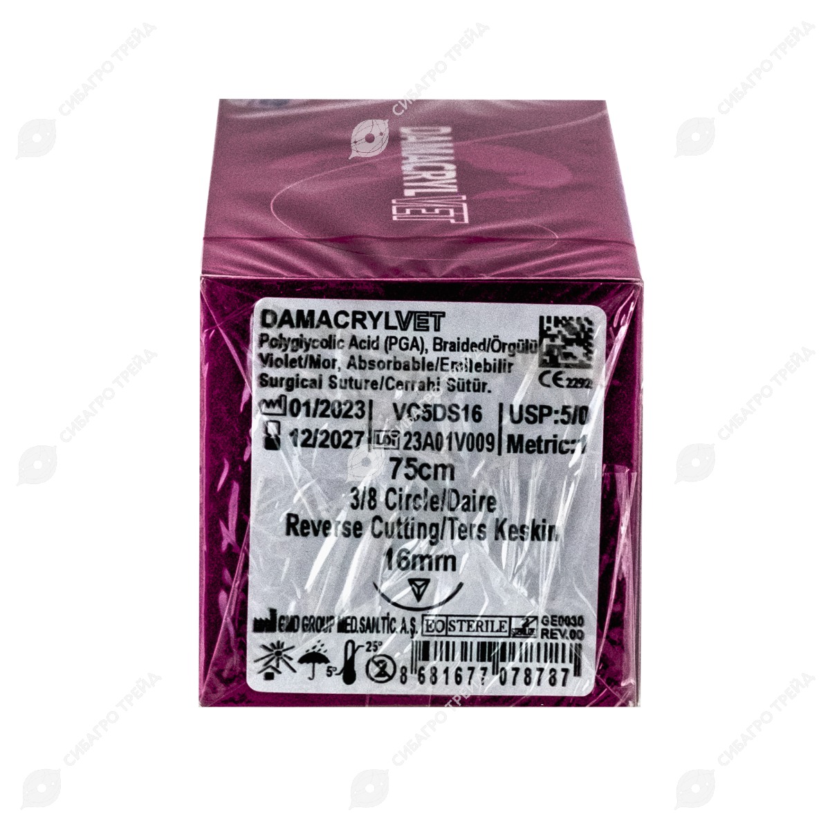 -----DAMACRYL (ПГА) плетеная рассасывающаяся нить (1 * 75 см, 5-0) с иглой 16 мм, 3/8, обратно-режущая, 12 шт