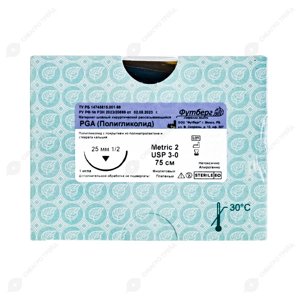 Нить PGA (ПГА), фиолетовый, Metric (EP) 2 USP 3/0, 75 см 1 игла режущая, 25 мм, изгиб 1/2, 12 шт