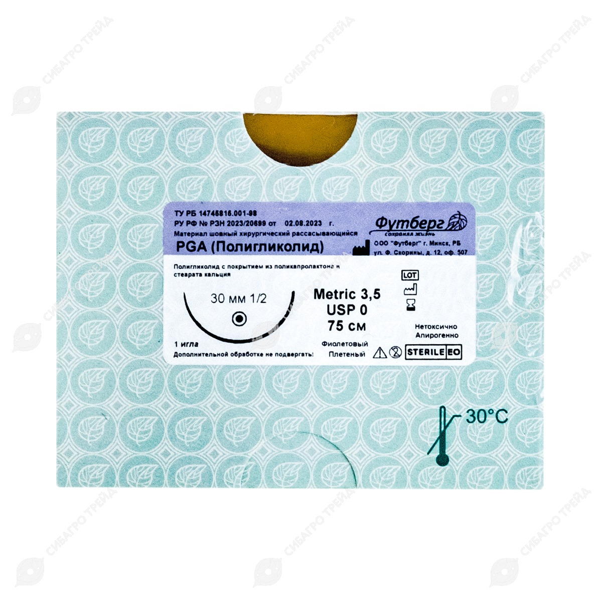 Нить PGA (ПГА), фиолетовый, Metric (EP) 3,5 USP 0, 75 см 1 игла колющая, 30 мм, изгиб 1/2, 12 шт