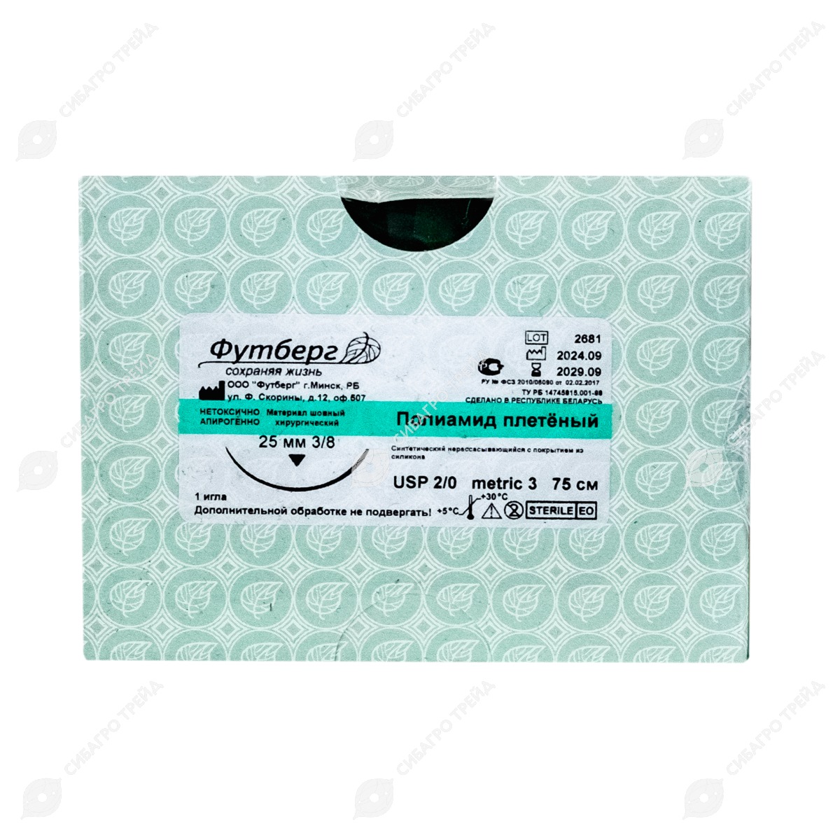 Нить Полиамид плетеный, неокраш Metric (EP) 3 USP 2/0, 75 см 1 игла реж, 25 мм, изгиб 3/8, 12 шт