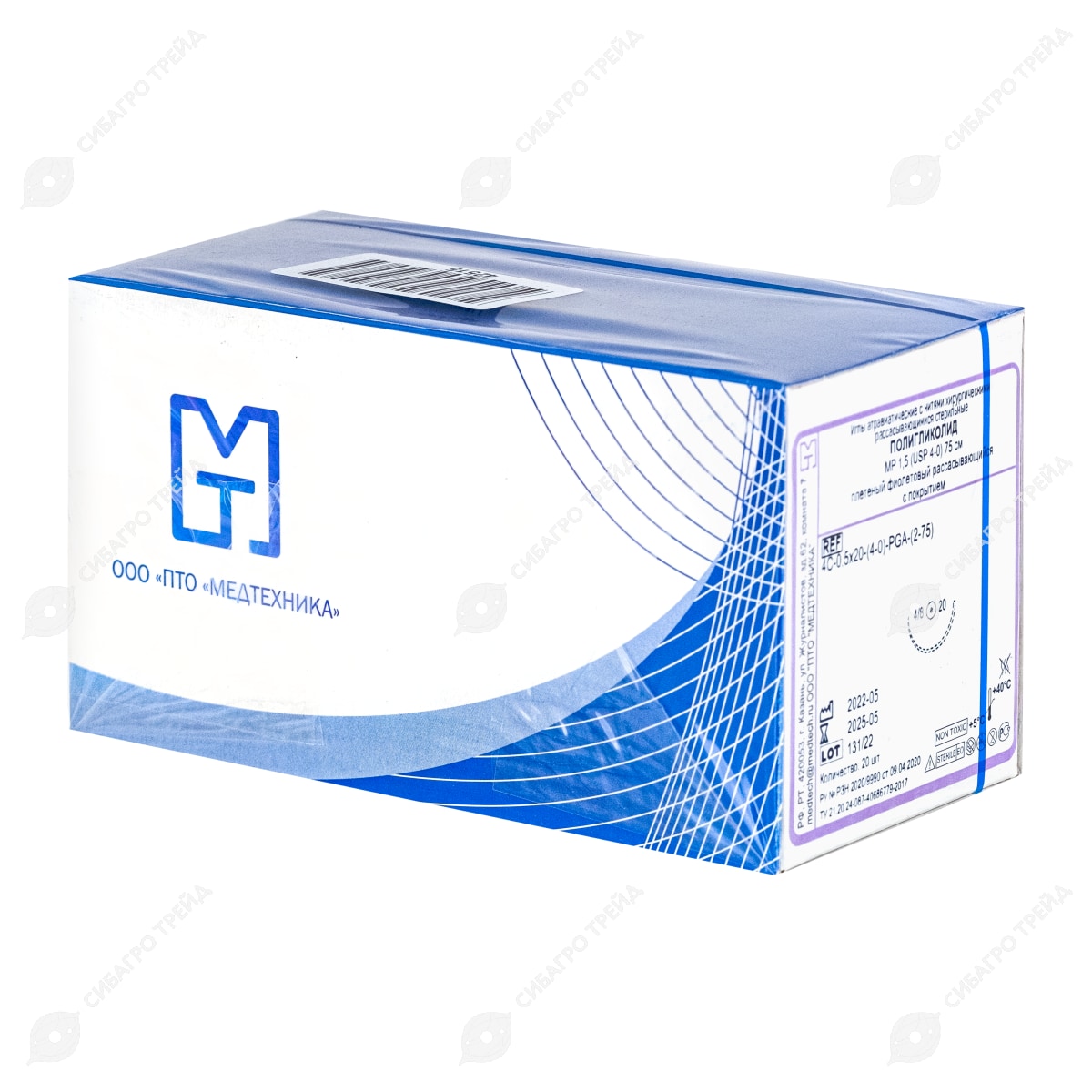 Нить PGA (ПГА), фиолетовый MP 1,5 (USP 4-0), 75 см 1 игла колющая, 20 мм, изгиб 1/2, 20 шт, МТ