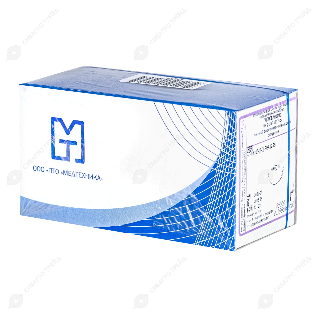 Нить PGA (ПГА), фиолетовый MP 2 (USP 3-0), 75 см 1 игла колющая, 25 мм, изгиб 1/2, 20 шт, МТ