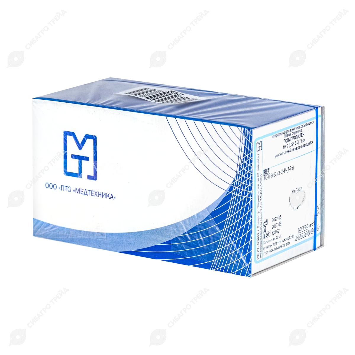 Нить ПОЛИПРОПИЛЕН, MP 2 (USP 3-0), 75 см 1 игла колющая, 22 мм, изгиб 1/2, 20 шт, МТ