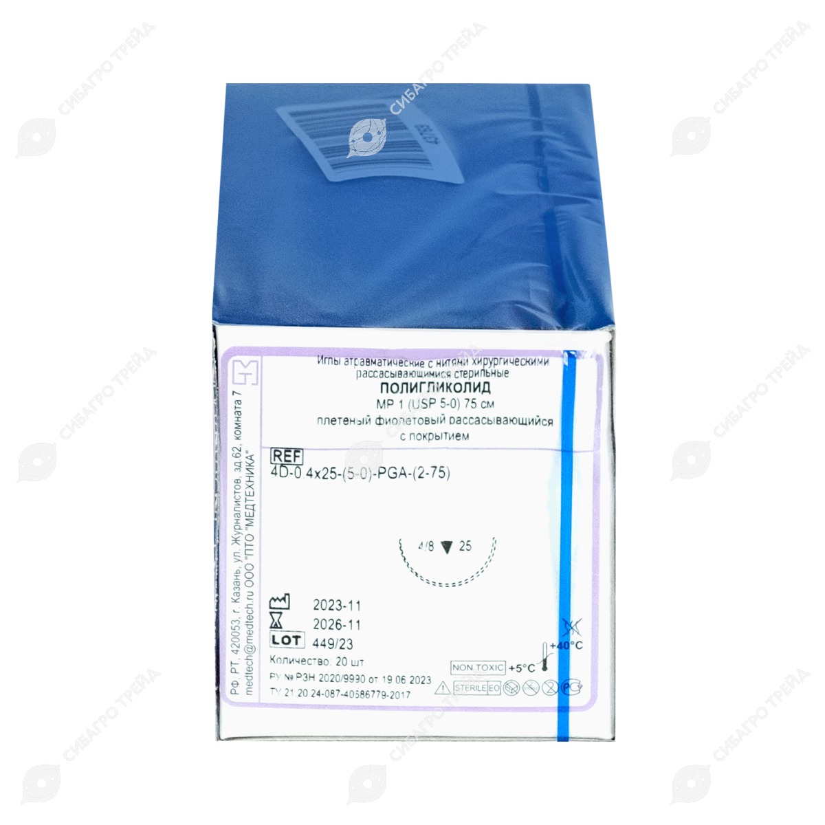 Нить PGA (ПГА), фиолетовый MP 1 (USP 5-0), 75 см 1 игла режущая, 25 мм, изгиб 1/2, 20 шт, МТ